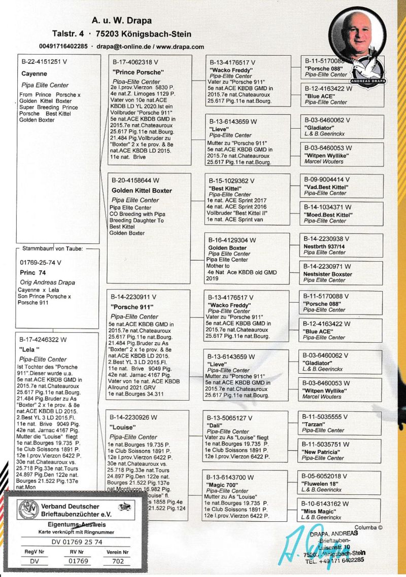**UWAGA PODBICIE NA TEJ AUKCJI WYNOSI 50 ZŁ** Oryginalny gołąb z hodowli Andreasa Drapy. Szczegóły pochodzenia w rodowodzie. Oferowany gołąb to prawodopodobnie SAMIEC. Gołąb jest własnością Andreasa Drapy i znajduje się już w Polsce u kolegi Roberta Grochowskiego. Gołębia można obejrzeć w Urbanowicach woj. opolskie, po wcześniejszym kontakcie telefonicznym. Sprzedający może zorganizować transport gołębia. Koszt przesyłki do najbliższego większego miasta obok miejscowości kupującego to około 70-100zł. Więcej informacji pod numerem 600133330