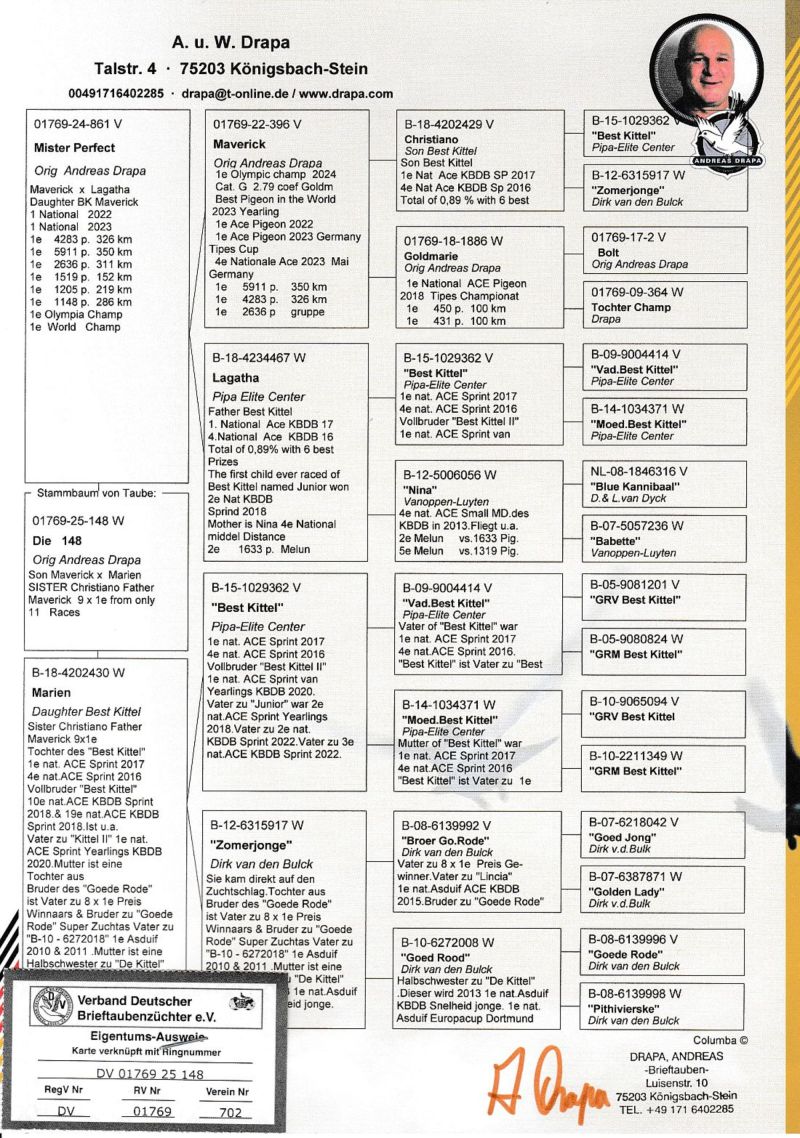 **UWAGA PODBICIE NA TEJ AUKCJI WYNOSI 50 ZŁ** Oryginalny gołąb z hodowli Andreasa Drapy. Szczegóły pochodzenia w rodowodzie. Oferowany gołąb to prawodopodobnie SAMICA. Gołąb jest własnością Andreasa Drapy i znajduje się już w Polsce u kolegi Roberta Grochowskiego. Gołębia można obejrzeć w Urbanowicach woj. opolskie, po wcześniejszym kontakcie telefonicznym. Sprzedający może zorganizować transport gołębia. Koszt przesyłki do najbliższego większego miasta obok miejscowości kupującego to około 70-100zł. Więcej informacji pod numerem 600133330