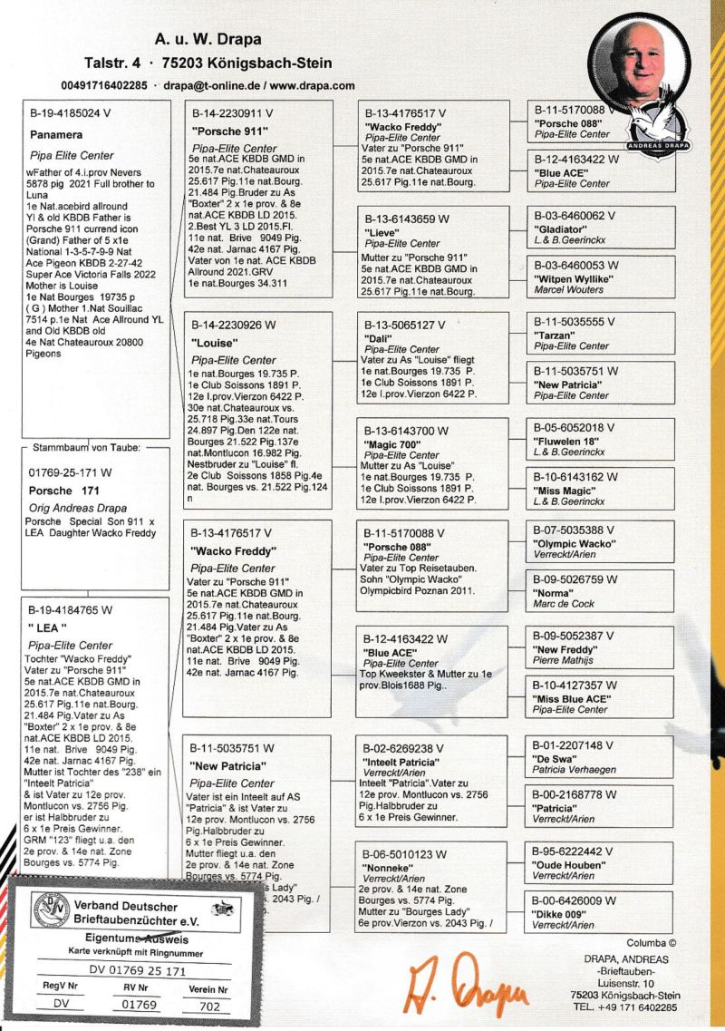 **UWAGA PODBICIE NA TEJ AUKCJI WYNOSI 50 ZŁ** Oryginalny gołąb z hodowli Andreasa Drapy. Szczegóły pochodzenia w rodowodzie. Oferowany gołąb to prawodopodobnie SAMICA. Gołąb jest własnością Andreasa Drapy i znajduje się już w Polsce u kolegi Roberta Grochowskiego. Gołębia można obejrzeć w Urbanowicach woj. opolskie, po wcześniejszym kontakcie telefonicznym. Sprzedający może zorganizować transport gołębia. Koszt przesyłki do najbliższego większego miasta obok miejscowości kupującego to około 70-100zł. Więcej informacji pod numerem 600133330
