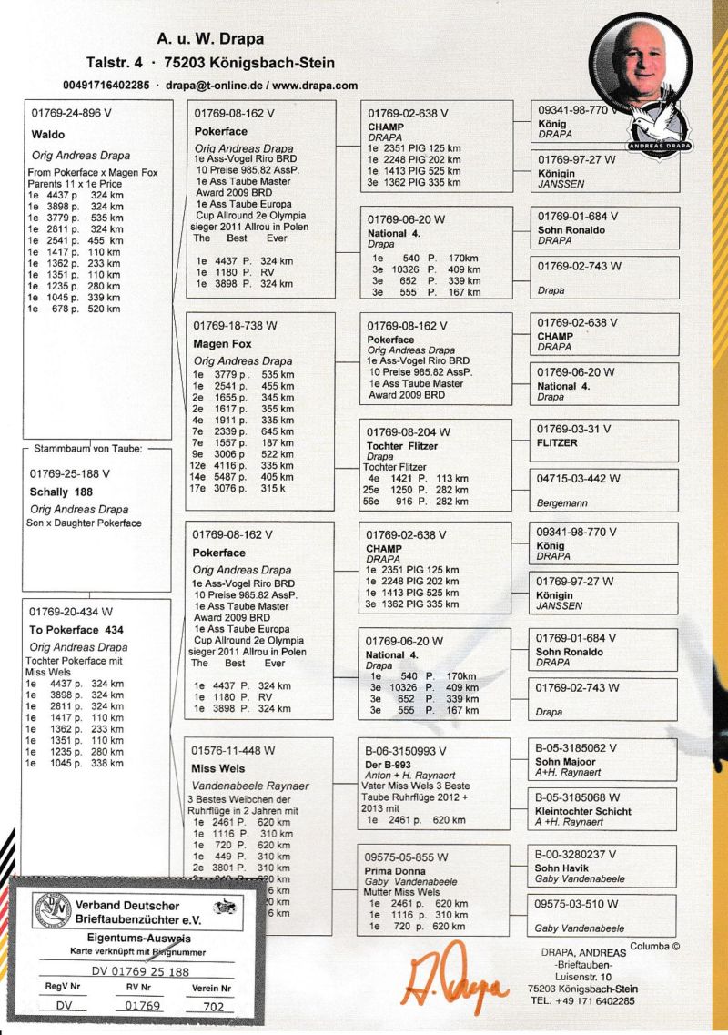 **UWAGA PODBICIE NA TEJ AUKCJI WYNOSI 50 ZŁ** Oryginalny gołąb z hodowli Andreasa Drapy. Szczegóły pochodzenia w rodowodzie. Oferowany gołąb to prawodopodobnie SAMIEC. Gołąb jest własnością Andreasa Drapy i znajduje się już w Polsce u kolegi Roberta Grochowskiego. Gołębia można obejrzeć w Urbanowicach woj. opolskie, po wcześniejszym kontakcie telefonicznym. Sprzedający może zorganizować transport gołębia. Koszt przesyłki do najbliższego większego miasta obok miejscowości kupującego to około 70-100zł. Więcej informacji pod numerem 600133330