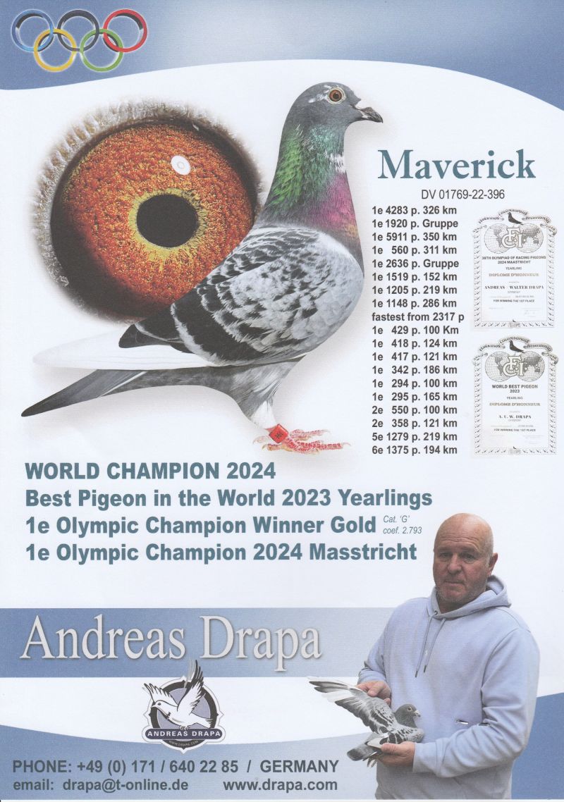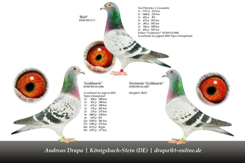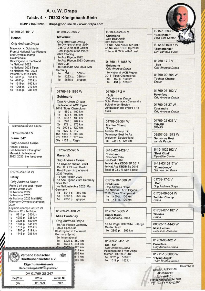 **UWAGA PODBICIE NA TEJ AUKCJI WYNOSI 50 ZŁ** Oryginalny gołąb z hodowli Andreasa Drapy. Szczegóły pochodzenia w rodowodzie. Oferowany gołąb to prawodopodobnie SAMIEC. Gołąb jest własnością Andreasa Drapy i znajduje się już w Polsce u kolegi Roberta Grochowskiego. Gołębia można obejrzeć w Urbanowicach woj. opolskie, po wcześniejszym kontakcie telefonicznym. Sprzedający może zorganizować transport gołębia. Koszt przesyłki do najbliższego większego miasta obok miejscowości kupującego to około 70-100zł. Więcej informacji pod numerem 600133330