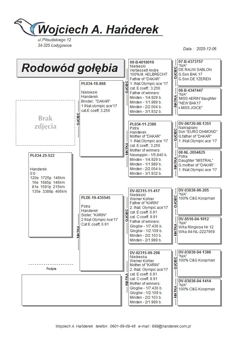 oryg. Wojciech Hańderek - Oddział PZHGP 028 Strumień - drużyna Grzegorz Kubeczek Gołąb lotowany w oddziale 028 Strumień w drużynie: Grzegorz Kubeczek. Wyniki gołębi na rodowodach. Szczegóły pochodzenia w rodowodzie i załączonych materiałach. Więcej informacji pod nr tel.: 511 261 394. *odbior na wystawie ogólnopolskiej
