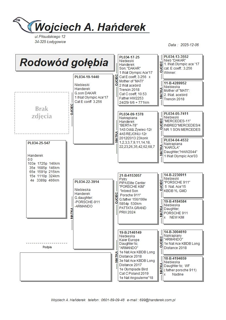 oryg. Wojciech Hańderek - Oddział PZHGP 028 Strumień - drużyna Grzegorz Kubeczek Gołąb lotowany w oddziale 028 Strumień w drużynie: Grzegorz Kubeczek. Wyniki gołębi na rodowodach. Szczegóły pochodzenia w rodowodzie i załączonych materiałach. Więcej informacji pod nr tel.: 511 261 394. *odbior na wystawie ogólnopolskiej