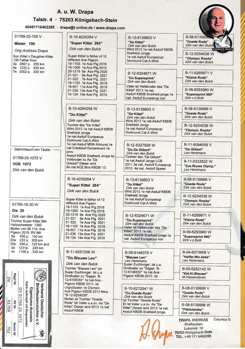 **UWAGA PODBICIE NA TEJ AUKCJI WYNOSI 50 ZŁ** Oryginalny gołąb z hodowli Andreasa Drapy. Szczegóły pochodzenia w rodowodzie. Oferowany gołąb to prawodopodobnie SAMIEC. Gołąb jest własnością Andreasa Drapy i znajduje się już w Polsce u kolegi Roberta Grochowskiego. Gołębia można obejrzeć w Urbanowicach woj. opolskie, po wcześniejszym kontakcie telefonicznym. Sprzedający może zorganizować transport gołębia. Koszt przesyłki do najbliższego większego miasta obok miejscowości kupującego to około 70-100zł. Więcej informacji pod numerem 600133330