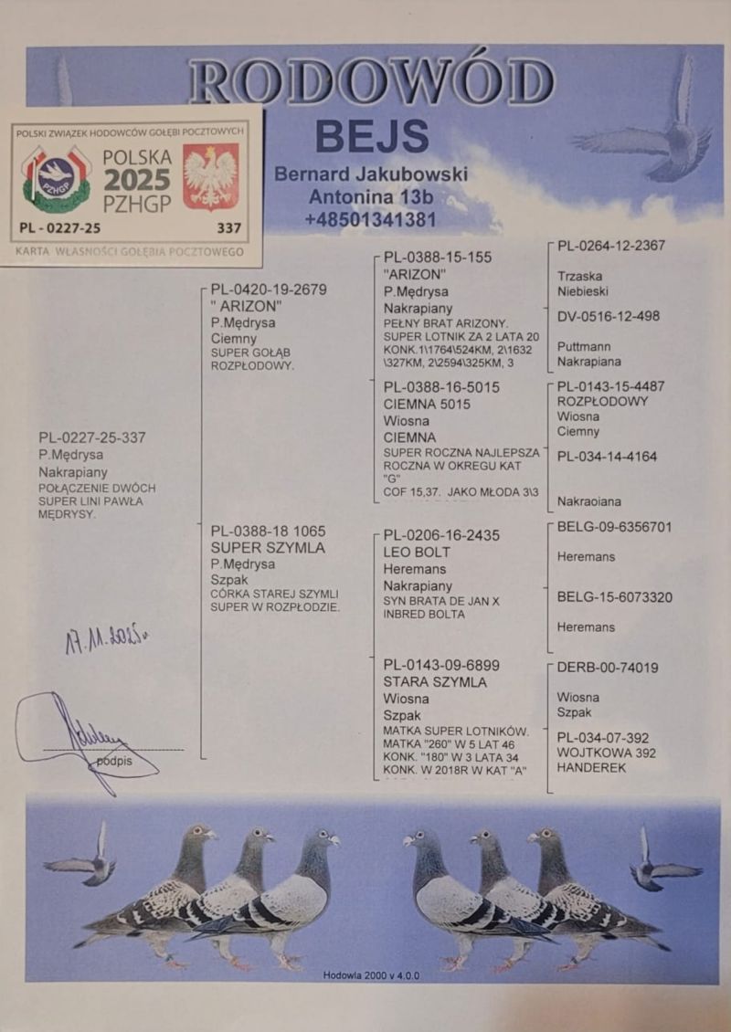 Płeć: młody gołąb Hodowca - rasa: oryg. Bernard Jakubowski Zakończenie: 21.12.2025 godz. 21:10