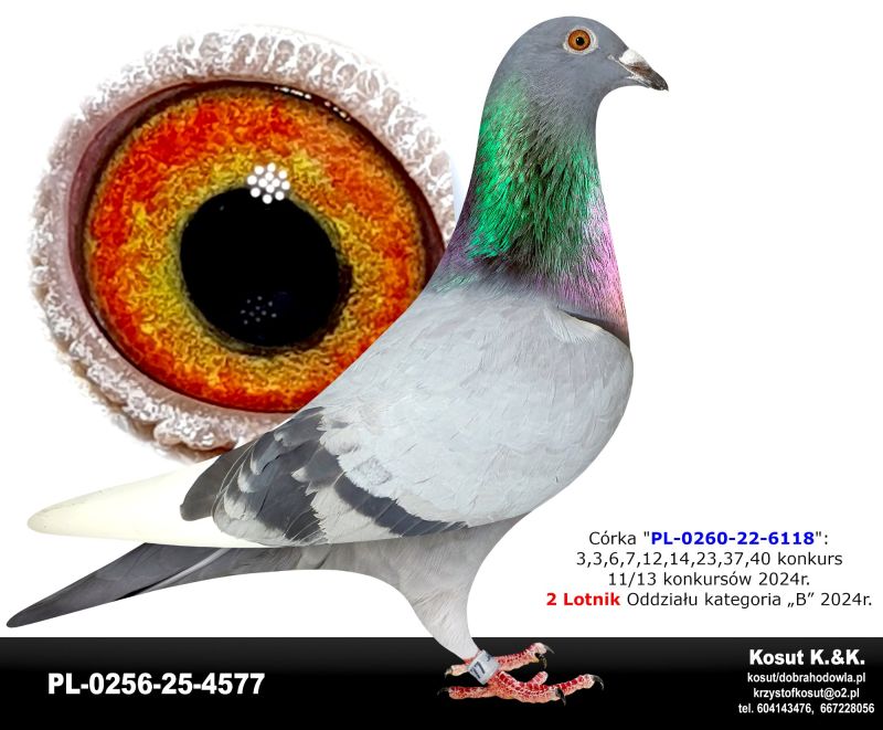Oryginalny gołąb z hodowli Krzysztof i Kamil Kosut. Szczegóły pochodzenia w rodowodzie. Więcej informacji na stronie www.facebook.com/kosut.dobrahodowla oraz pod nr tel.: 667 228 056. Dostawa gołębi będzie realizowana po zakończeniu aukcji kurierem 165zł lub odbiór osobisty. Możliwy jest także odbiór na wystawie Ogólnopolskiej w Katowicach. Prawdopodobnie *SAMICA*