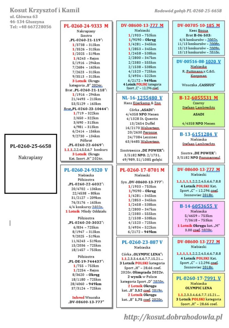 PL-0260-25-6658 – Inbred Wnuk „777” – 1,1,1,1,1 konkurs 4 Lotnik Polski oryg. Kosut K. & K. I vice Mistrz POLSKI