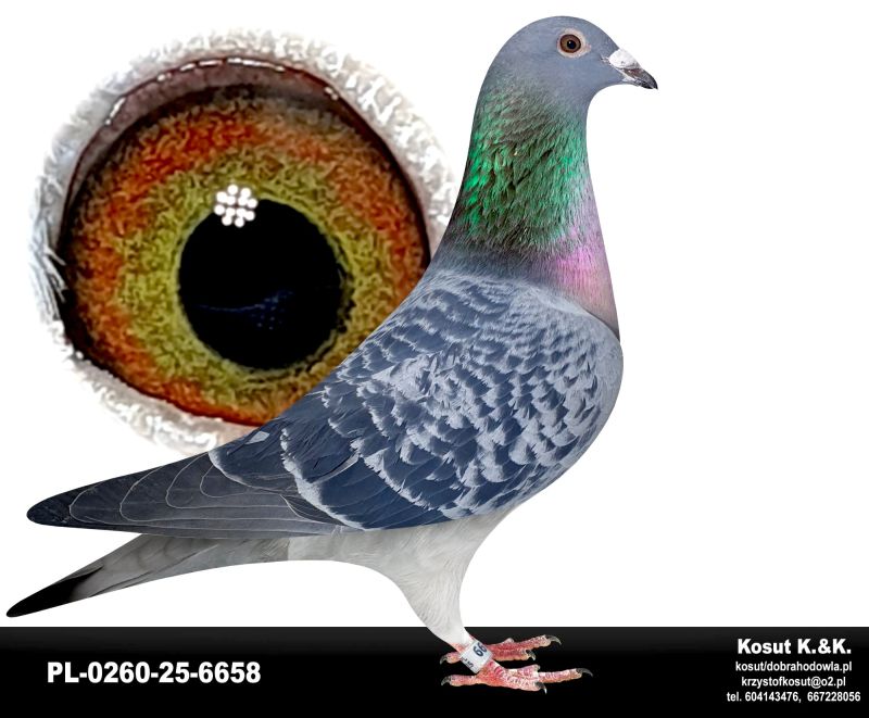 Oryginalny gołąb z hodowli Krzysztof i Kamil Kosut. Szczegóły pochodzenia w rodowodzie. Więcej informacji na stronie facebook.com/kosut.dobrahodowla oraz pod nr tel.: 667 228 056. Dostawa gołębi będzie realizowana po zakończeniu aukcji kurierem 165zł lub odbiór osobisty. Możliwy jest także odbiór na wystawie Ogólnopolskiej w Katowicach.*Prawdopodobnie Samiec*