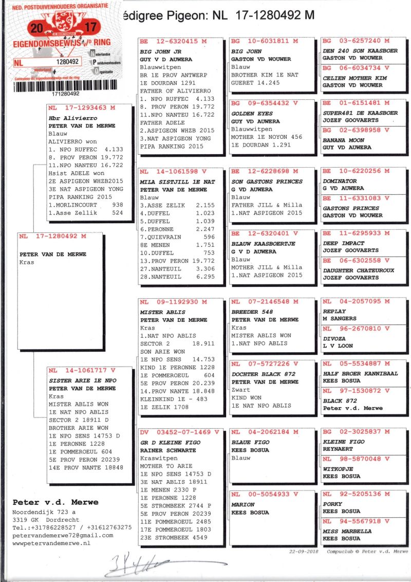 Oryginalny gołąb z hodowli Peter van de Merwe, szczegóły pochodzenia w rodowodzie. Dostawa gołębi będzie realizowana po zakończeniu aukcji przez kuriera - 150zł.