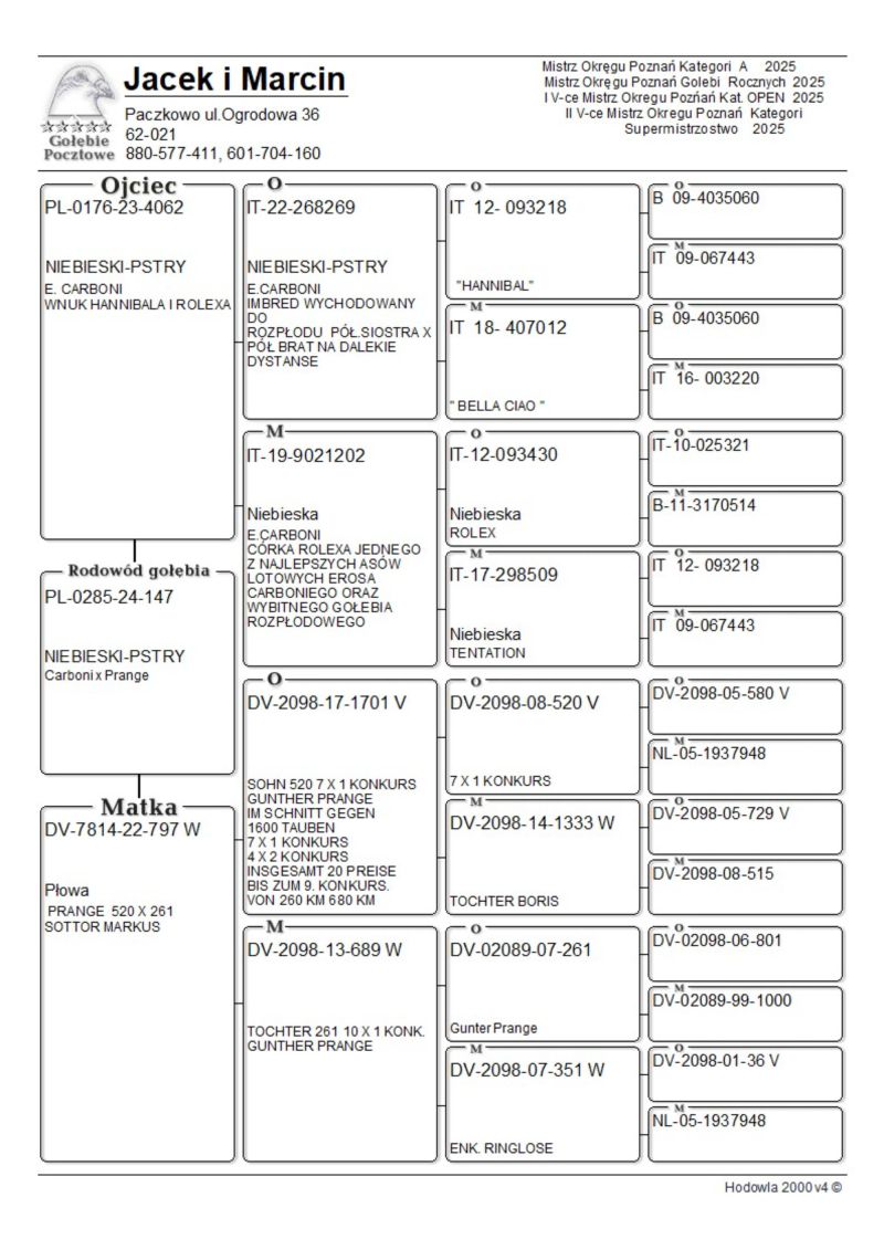 Oryginalny Gołąb z hodowli Jacek.K-Marcin-M , Szczegóły pochodzenie w rodowodzie ,Niektóre wyniki z 2025 Mistrz oddziału 5/50,Mistrz oddziału 8 pierwszych z całośći,Mistrz oddziału 3 pierwsze według Coef, I V-ve Mistrz oddziału 5 pierwszych z 10 typowanych ,Mistrz oddziału kat A ,Mistrz oddziału kat B ,Mistrz oddziału kat roczne,Najlepszy lotnik roczny,Najlepsze lotniki oddziału 1,2,4,12,14,15,16,19,20,21,22,23,29,32,33itd I V-ce Mistrz Super mistrzostwo oddziału ,Mistrz okręgu Poznań kat A ,Mistrz okręgu Poznań kat Roczne,I V-ce mistrz okręgu Poznań kat open Dorosłe, II V-ce Mistrz Supermistrzostwo okręgu , odbiór osobisty lub kurier 150zł , kontakt 880-577-411