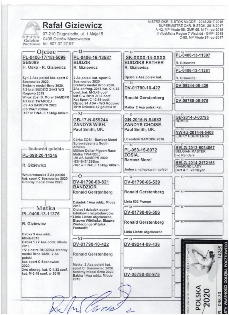 Informacje o pochodzeniu ptaka zawarte w rodowodzie. Więcej informacji pod nr telefonu 609886708
