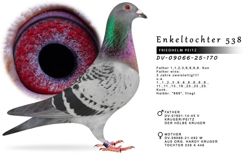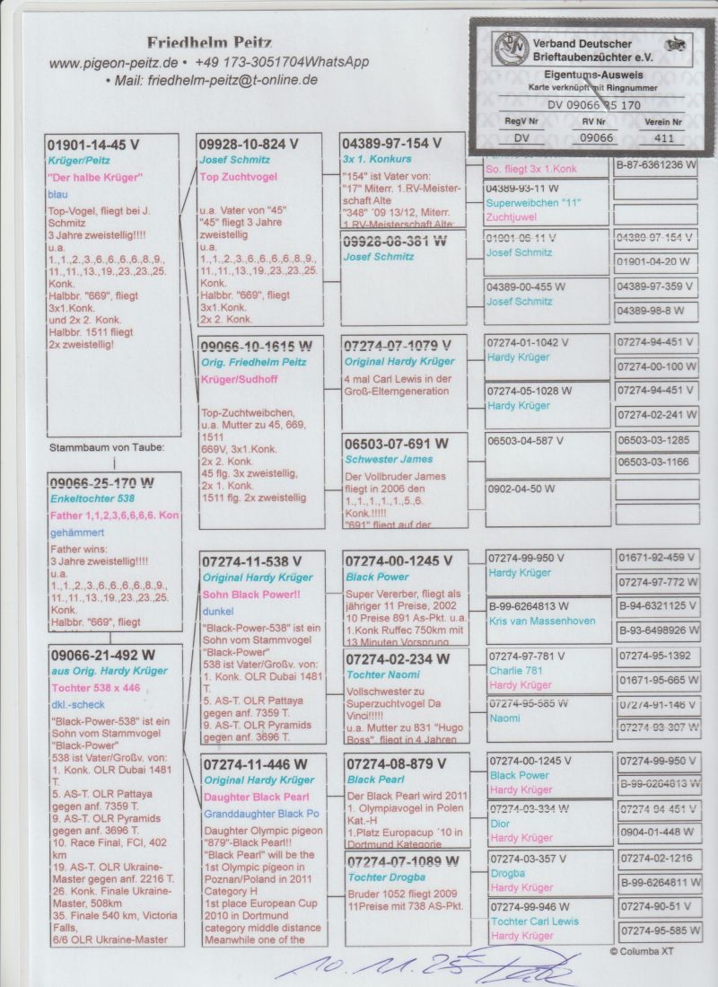 Młoda samica oryg. Friedhelm Peitz/H.Kruger. Ojcem samicy jest "45" super lotnik zdobył m.in:1;1;2;3;6;6;6;6;8;9 kon. matka to prawnuczka Black Power 100% Hardy Kruger! koszt wysyłki 150 zł(1-3 szt)