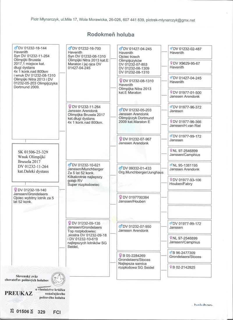 Havenith, gołąb dalekodystansowy.Wnuk (wnuczka) Olimpijki Bruksela 2017 kat.E daleki dystans DV 01232-11-264, m.in. zdobyła 4x 1 konk. na odległości nad 800 km. Rodzina Seidel posiada siedmiu Olimpijczyków w kategorii daleki dystans, m.in. DV 01232-15-306 Olimpijka z Oradea 2022, pierwszy gołąb niemiec i 17 świata. Gołąbki zaszczepione msv i odrobaczone. Transport gołębi kurierem po wcześniejszym uzgodnieniu albo odbiór osobisty.