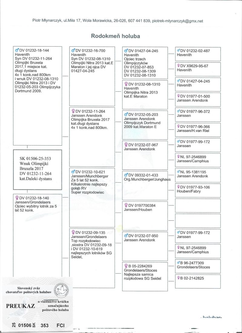 Havenith, gołąb dalekodystansowy.Wnuk (wnuczka) Olimpijki Bruksela 2017 kat.E daleki dystans DV 01232-11-264, m.in. zdobyła 4x 1 konk. na odległości nad 800 km. Rodzina Seidel posiada siedmiu Olimpijczyków w kategorii daleki dystans, m.in. DV 01232-15-306 Olimpijka z Oradea 2022, pierwszy gołąb niemiec i 17 świata. Gołąbki zaszczepione msv i odrobaczone. Transport gołębi kurierem po wcześniejszym uzgodnieniu albo odbiór osobisty.