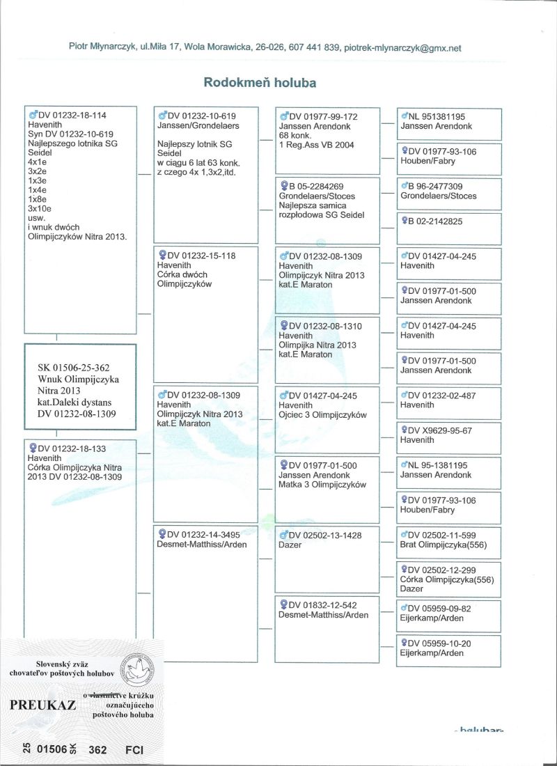 Havenith ,gołąb dalekodystansowy.Wnuk (wnuczka) Olimpijczyka Nitra 2013 DV 01232-08-1309 . Rodzina Seidel posiada siedmiu Olimpijczyków w kategorii daleki dystans, m.in. DV 01232-15-306 Olimpijka z Oradea 2022, pierwszy gołąb niemiec i 17 świata. Gołąbki zaszczepione msv i odrobaczone. Transport gołębi kurierem po wcześniejszym uzgodnieniu albo odbiór osobisty.