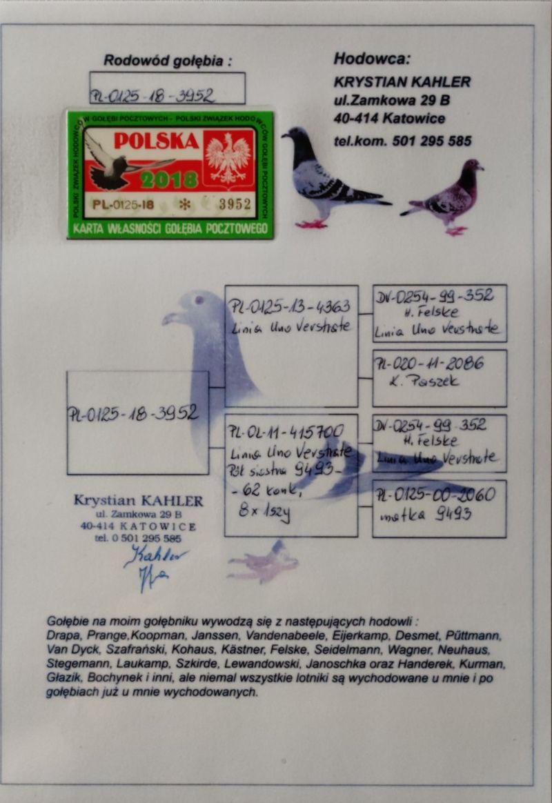 Samiczka, oryg.Krystian Kahler - wnuczka, inbred na super rozpłodowca!!! DV-0254-99-352 oryg.H. Felske. Gołąb zdrowy, płodny. Szczegóły pochodzenia w rodowodzie. Gołąb od 7 lat u mnie w rozpłodzie! Więcej informacji pod nr tel.:602 846 264
