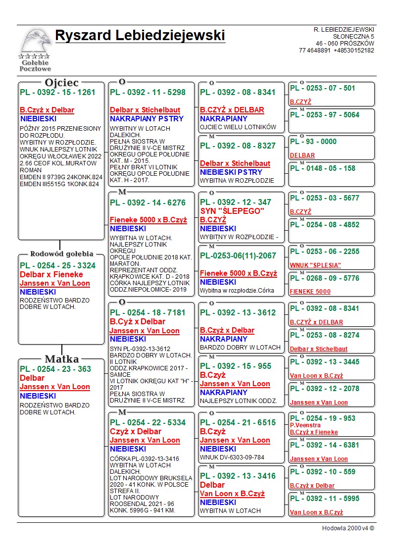 *prawdopodobnie samica** Oryginalny gołąb z hodowli Ryszard Lebiedziejewskiego. Szczegóły pochodzenia w rodowodzie. Więcej informacji pod nr tel.: 530 152 182. **Gołębie po kuracjach przygotowane do sezonu. **Transport gołębi prywatnym kurierem 100 zł do 3 szt. od 4szt do 6szt 150zł.