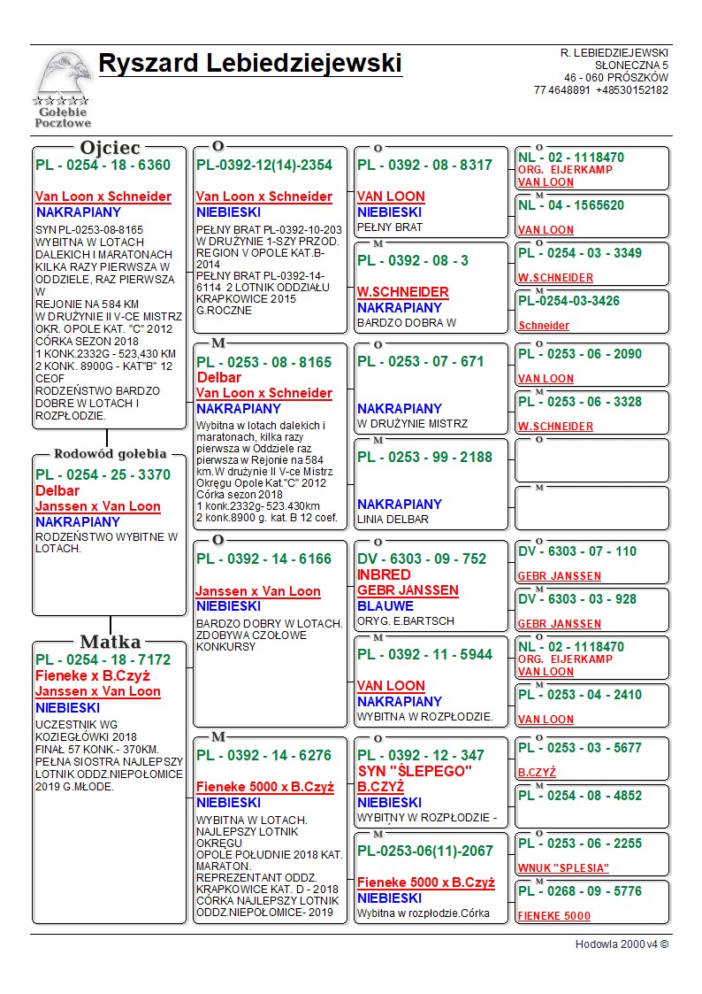 *prawdopodobnie samica** Oryginalny gołąb z hodowli Ryszard Lebiedziejewskiego. Szczegóły pochodzenia w rodowodzie. Więcej informacji pod nr tel.: 530 152 182. **Gołębie po kuracjach przygotowane do sezonu. **Transport gołębi prywatnym kurierem 100 zł do 3 szt. od 4szt do 6szt 150zł.