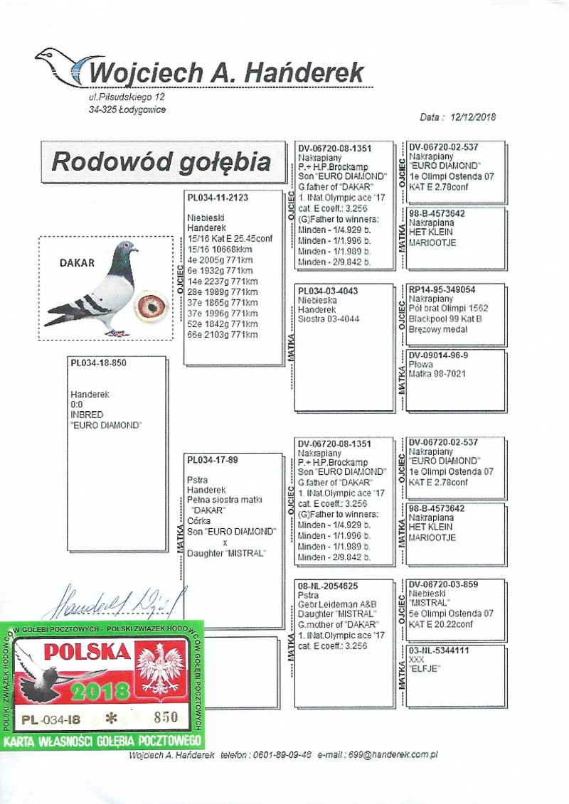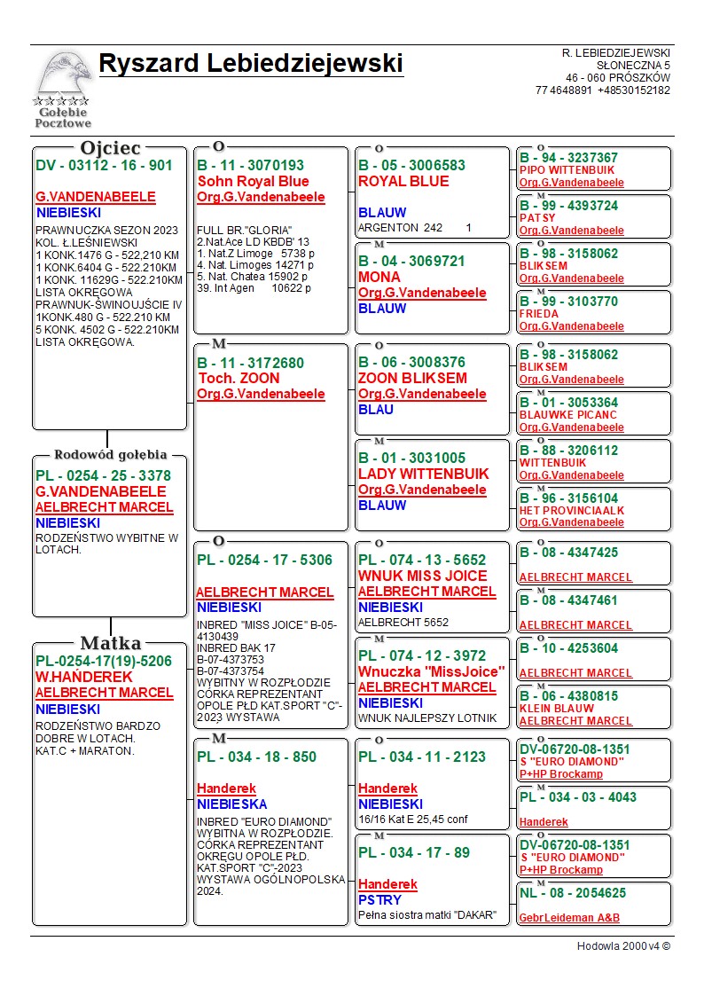 *prawdopodobnie samica** Oryginalny gołąb z hodowli Ryszard Lebiedziejewskiego. Szczegóły pochodzenia w rodowodzie. Więcej informacji pod nr tel.: 530 152 182. **Gołębie po kuracjach przygotowane do sezonu. **Transport gołębi prywatnym kurierem 100 zł do 3 szt. od 4szt do 6szt 150zł.