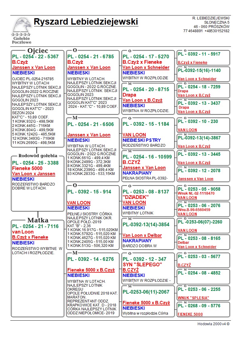 *prawdopodobnie samica** Oryginalny gołąb z hodowli Ryszard Lebiedziejewskiego. Szczegóły pochodzenia w rodowodzie. Więcej informacji pod nr tel.: 530 152 182. **Gołębie po kuracjach przygotowane do sezonu. **Transport gołębi prywatnym kurierem 100 zł do 3 szt. od 4szt do 6szt 150zł.
