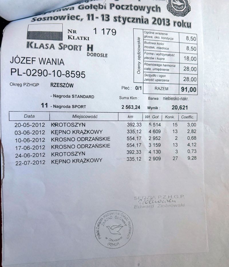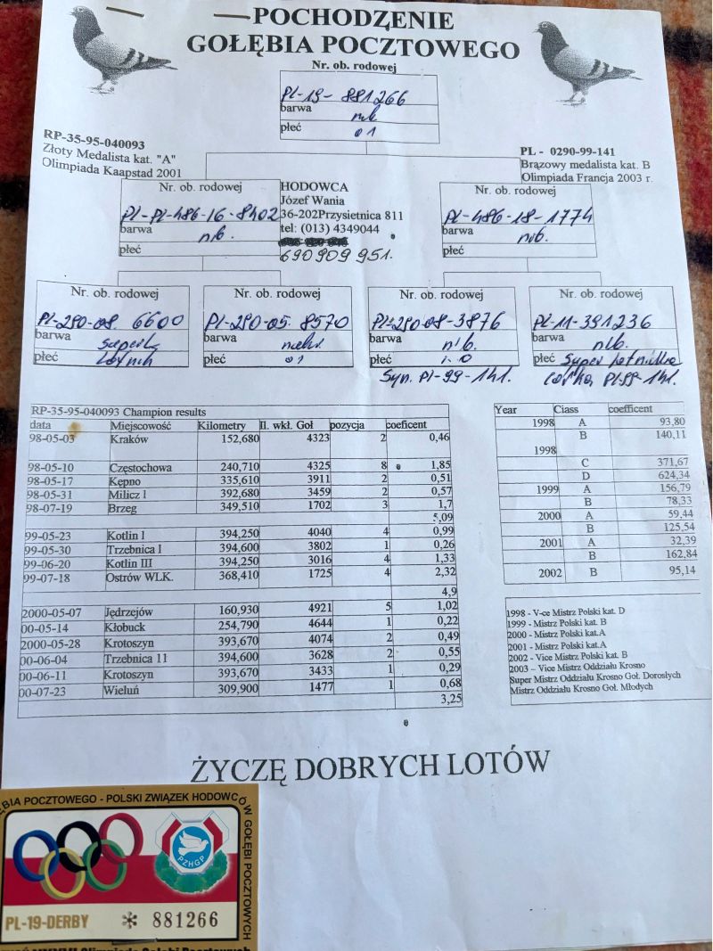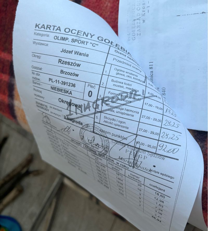 Oryginalny gołąb z hodowli Józefa Wani. Szczegóły pochodzenia w rodowodzie.