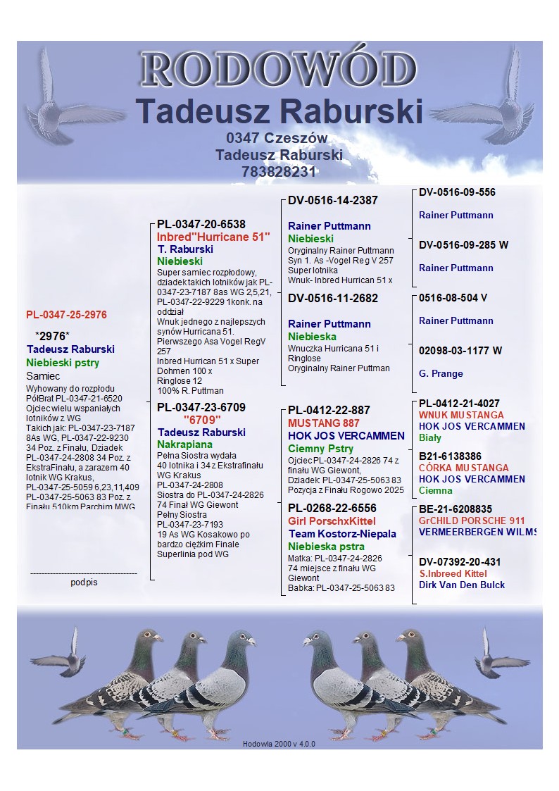 Hodowla skupiona w lotach gołębi na wspólnych gołębnikach z wieloma sukcesami. Zaprasza Państwa do licytacji wartościowego materiału do dalszej hodowli. Proponowany gołąb to półsiostra "6520" Ojca i dziadka wielu wspaniałych lotników z WG. Linia moich dwóch bazowych par rozpłodowych, wielu kuzynów osiąga sukcesy na wspólnych gołębnikach. Więcej informacji w rodowodzie oraz pod nr. tel. WYSYŁKA 100ZŁ