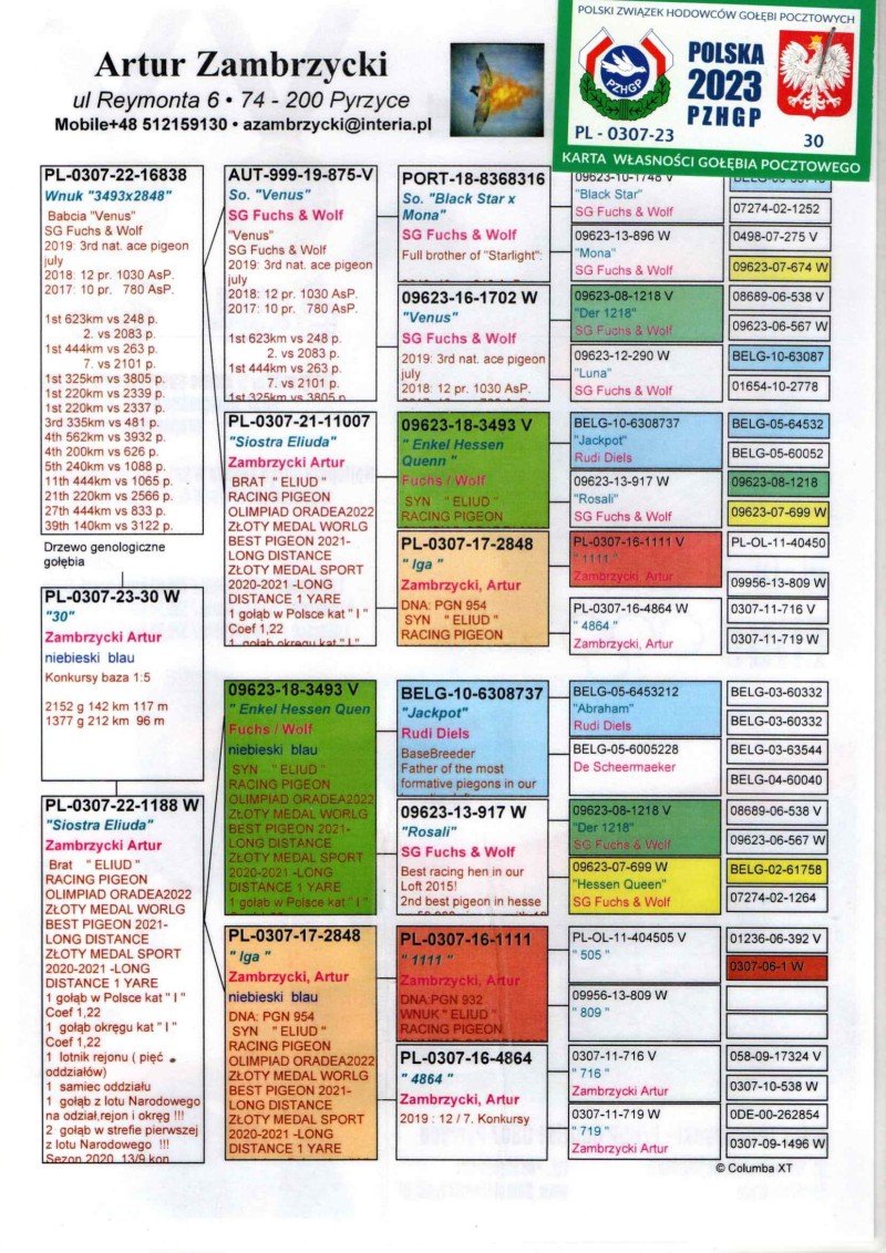 Oryginalny gołąb z hodowli Krzysztofa Moskala. Szczegóły pochodzenia w rodowodzie. Więcej informacji pod nr tel.: 607 063 552 *możliwy jest prywatny transport - 150zł/ paczka (max 4 gołębie).