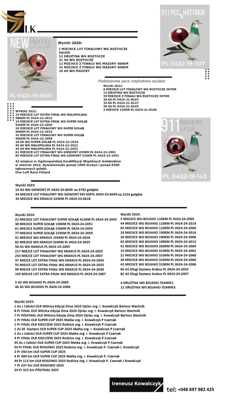 Gołąb z hodowli Ireneusz Kowalczyk. Informację o gołębiu dostępne w rodowodzie. Więcej informacji pod numerem telefonu: 697-982-425. Wysyłka po stronie kupującego