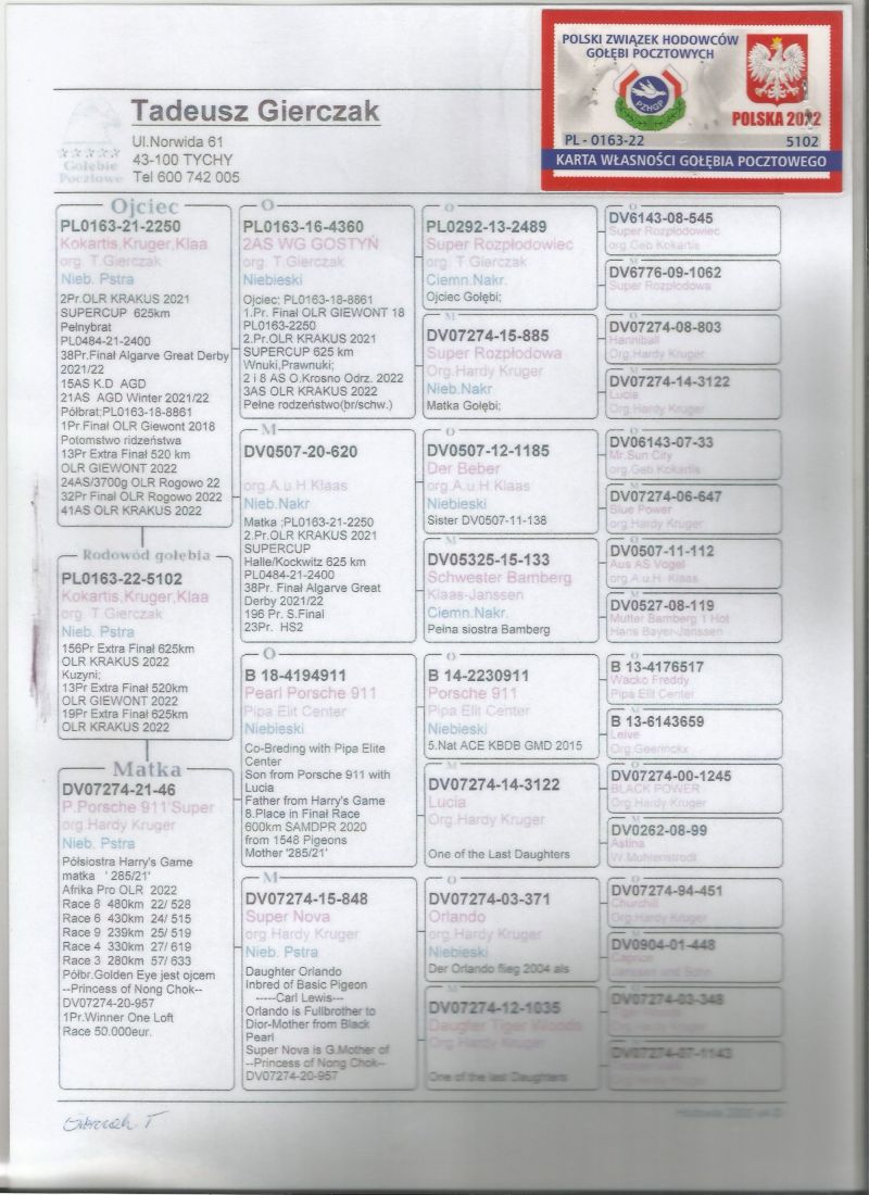 Gołąb z hodowli Ireneusz Kowalczyk. Informację o gołębiu dostępne w rodowodzie. Więcej informacji pod numerem telefonu: 697-982-425. Wysyłka po stronie kupującego