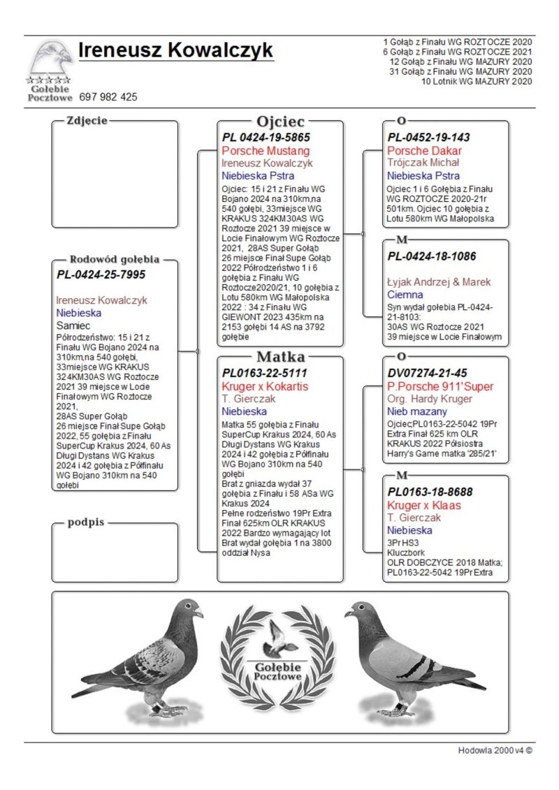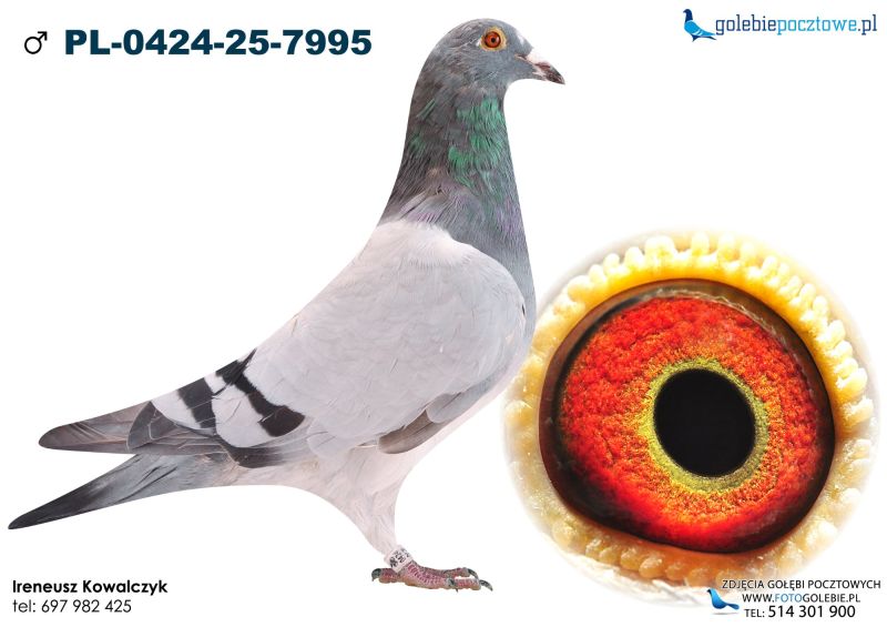 Gołąb z hodowli Ireneusz Kowalczyk. Informację o gołębiu dostępne w rodowodzie. Więcej informacji pod numerem telefonu: 697-982-425. Wysyłka po stronie kupującego