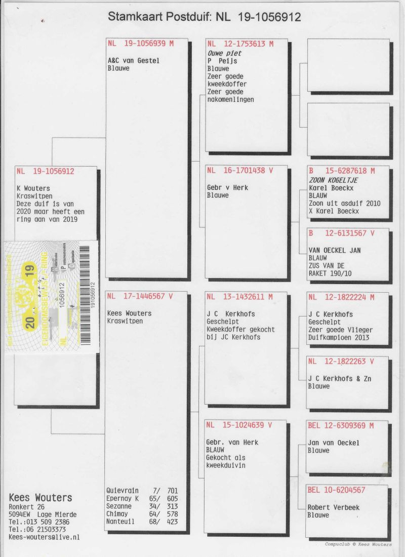 Oryginalny gołąb z hodowli Kees Wouters. Szczegóły pochodzenia w rodowodzie. Więcej informacji pod nr tel.: 571-022-699