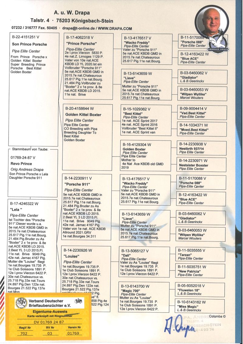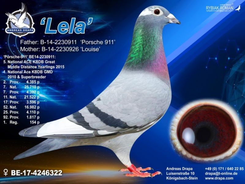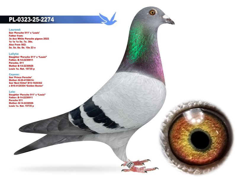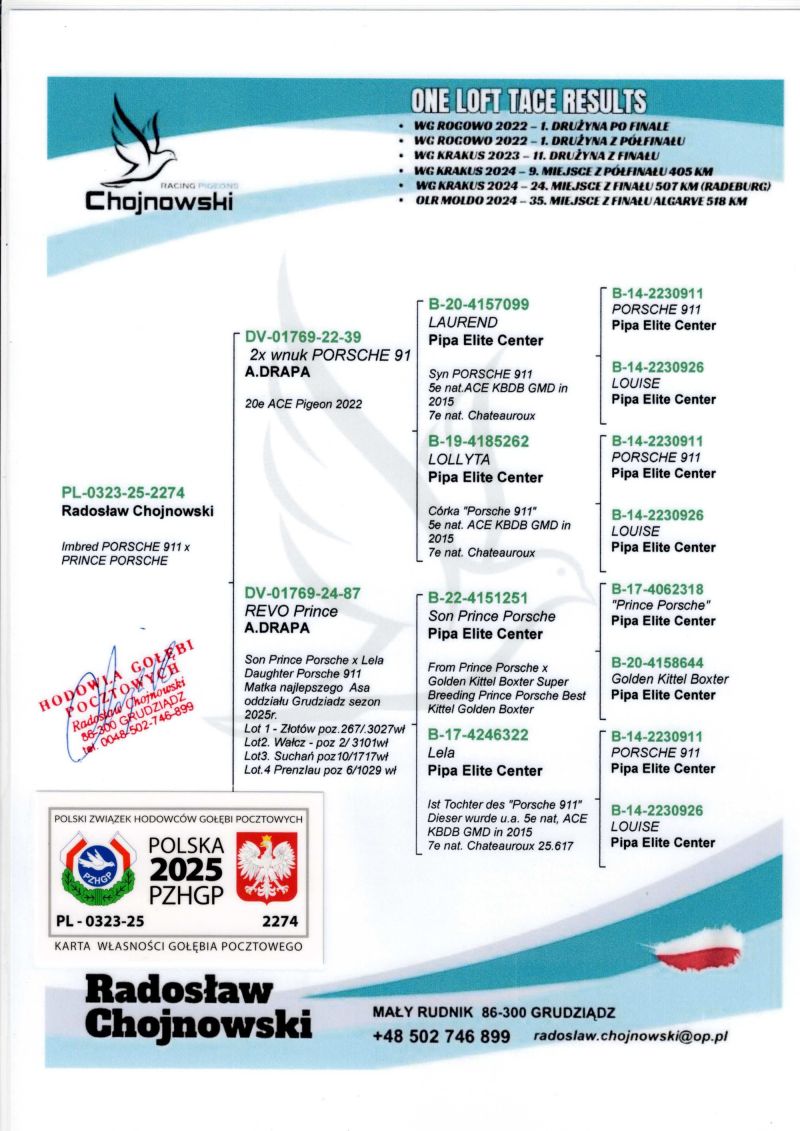 Ojciec oferowanego gołębia to wnuk PORSCHE 911 z hodowli A.Drapa , matka natomiast to wnuczka PRINCE PORSCHE zakupiona z gołębnika A.Drapa . Oferowany gołąb to prawdopodobnie SAMICZYK. Koszt transportu 100 zł . Gołąb wychowany z boksu indywidualnego .