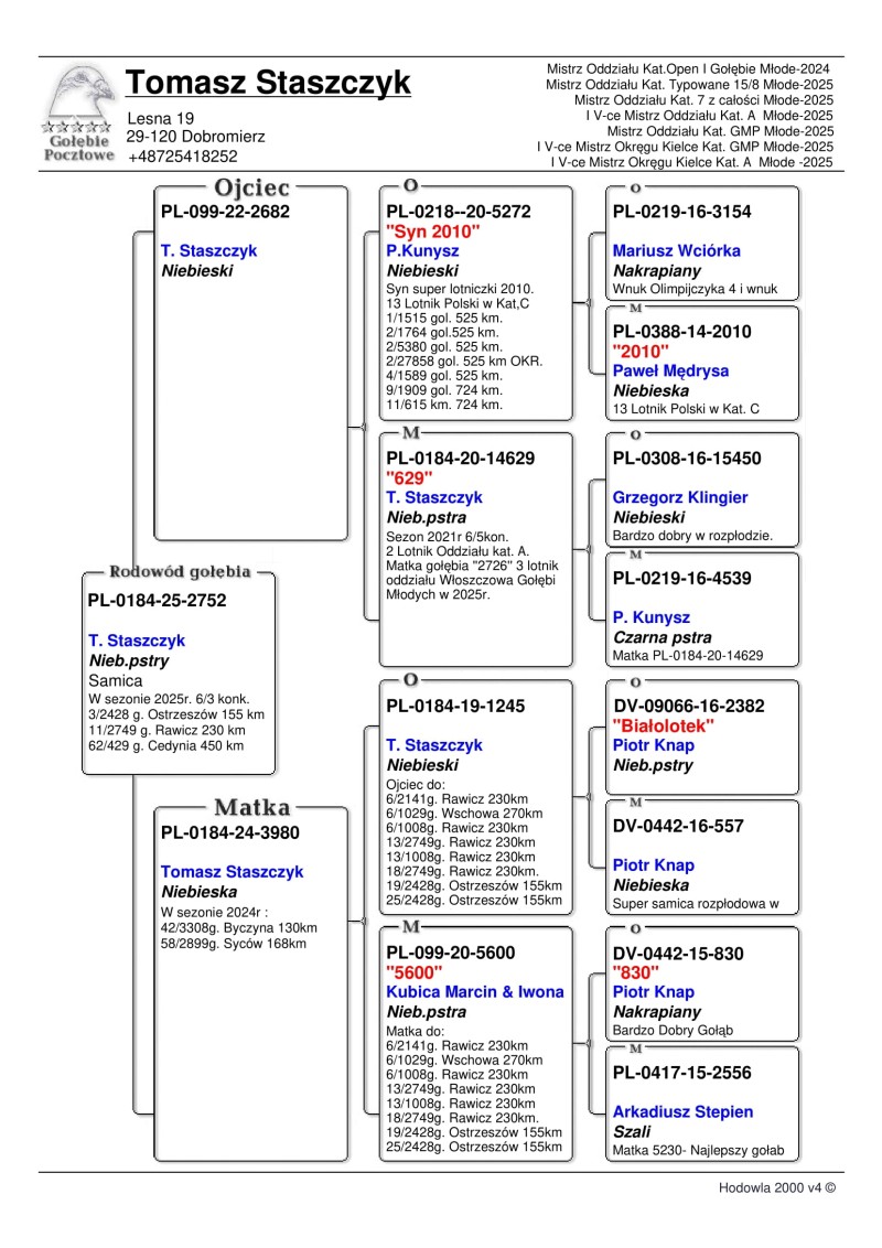 PL-0184-25-2752 oryg. Tomasz Staszczyk, I V-ce Mistrz Okręgu Kielce GMP Młode,I V-ce Mistrz Okręgu Kielce kat. A Młode, gołąb lotowany 6/3 konk.