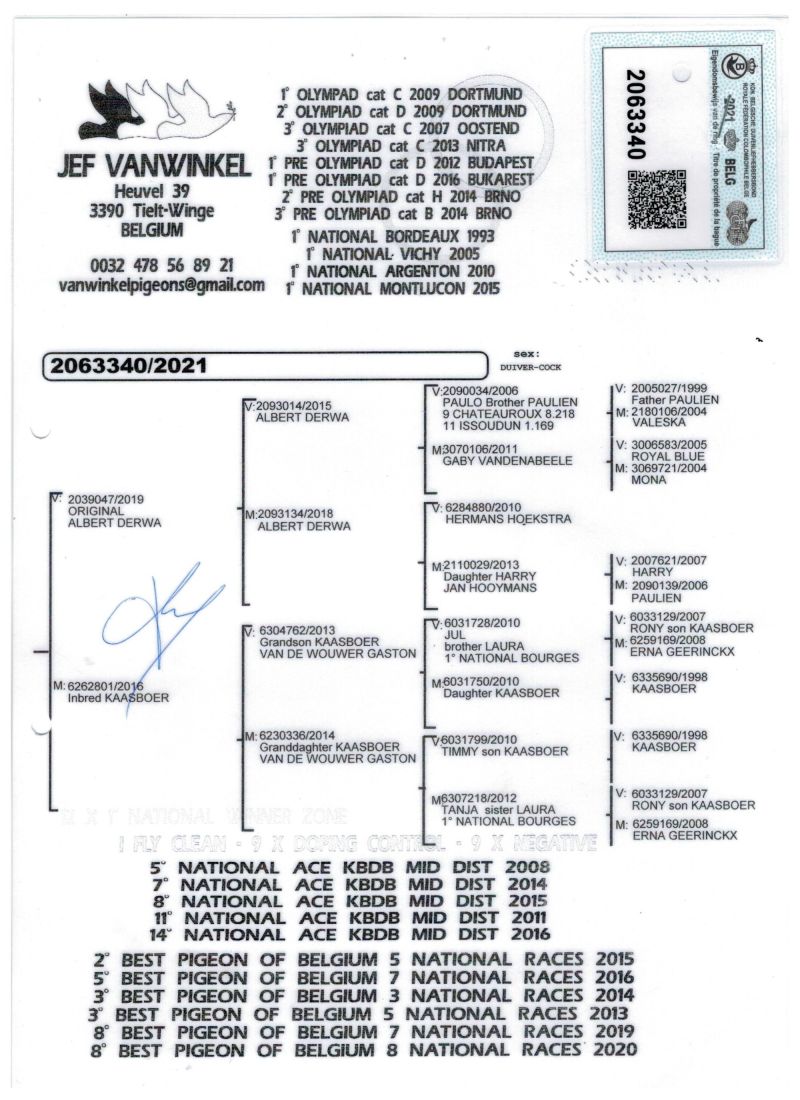 Oryginalny gołąb z mistrzowskiego gołębnika JEFA VANWINKLA którego gołębie wielokrotnie reprezentowały Belgię na Olimpiadach oraz zwyciężały w lotach narodowych przeciwko kilkudziesięciu tysiącom gołębi.Serdecznie polecam.UWAGA!!! GOŁĘBIE DOSTARCZANE TYLKO PO WCZEŚNIEJSZEJ WPŁACIE NA KONTO BANKOWE!!! KOSZT TRANSPORTU 120 ZŁ (maksymalnie 3 gołębie w jednej paczce). KOSZTA TRANSPORTU KLIENCI BĘDĄ PŁACIĆ BEZPOŚREDNIO KIEROWCY KTÓRY PRZYWIEZIE GOŁĘBIE.