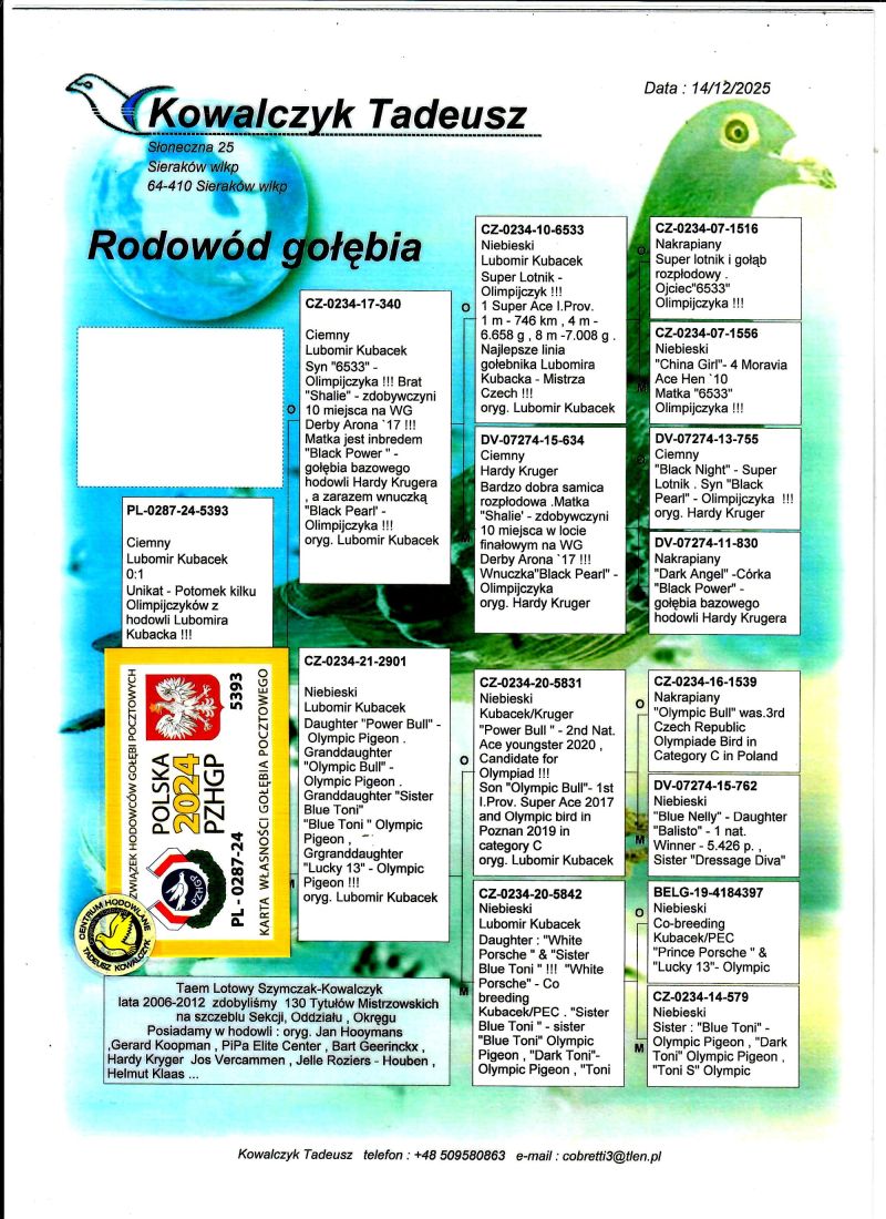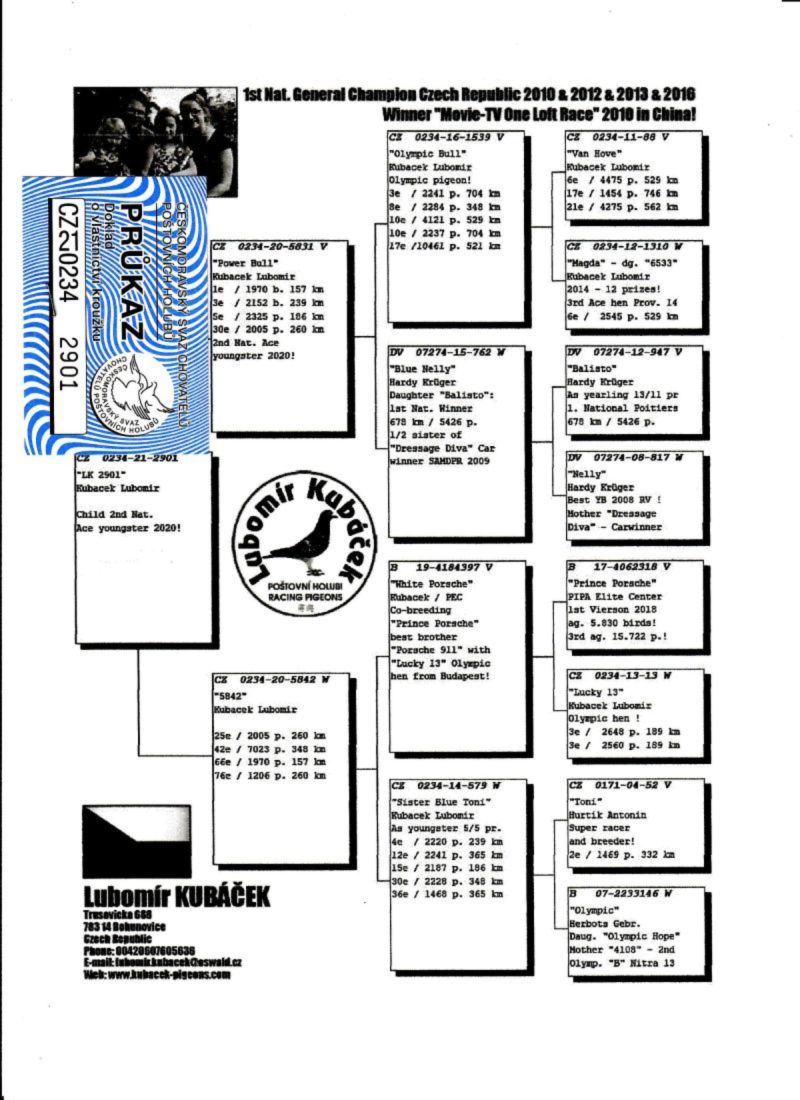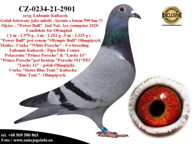 AUKCJA PROMOCYJNA ROCZNIKA 2025 (Cena obowiązuje wyłącznie na tej aukcji) Profesjonalna hodowla z wieloletnim doświadczeniem, posiadająca w swoim stadzie materiał najwyższej światowej klasy, wywodzący się od takich hodowców jak: Jan Hooymans, Gerard Koopman, Mike Ganus, Tjeerd & Jouke Elzinga, Gino Clicque, Jos Vercammen, Jelle Roziers, Bart Geerinckx, Batenburg – v/d Merwe, Altmiks – Pigeons, Jo & Florian Hendriks, Kornelis Winner Loft – linia „Romario”, W & F Ebben, Bert Braspenning, Dirk van den Bulck, Peter v/d Merwe, Jan van de Pasch, Van Elsacker-Jepsen, Roger Desmet – Matthijs, Arie Dijkstra, Leo Heremans, Pieter Veenstra, Gaby Vandenabeele, Karl-Heinz Wichert, Hardy Kruger, Helmut & Alfons Klaas, Gebr. Janssen. Najwyższej klasy materiał hodowlany – najlepsze linie danych Hodowców. Wszystkie wylicytowane gołębie będą dostarczane firmą kurierską.