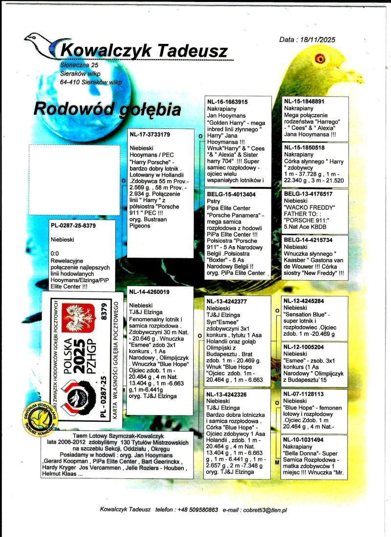 PL-0287-25-8379 Rewelacyjne połączenie najlepszych gołębi z hodowli Hooymans/Elzinga