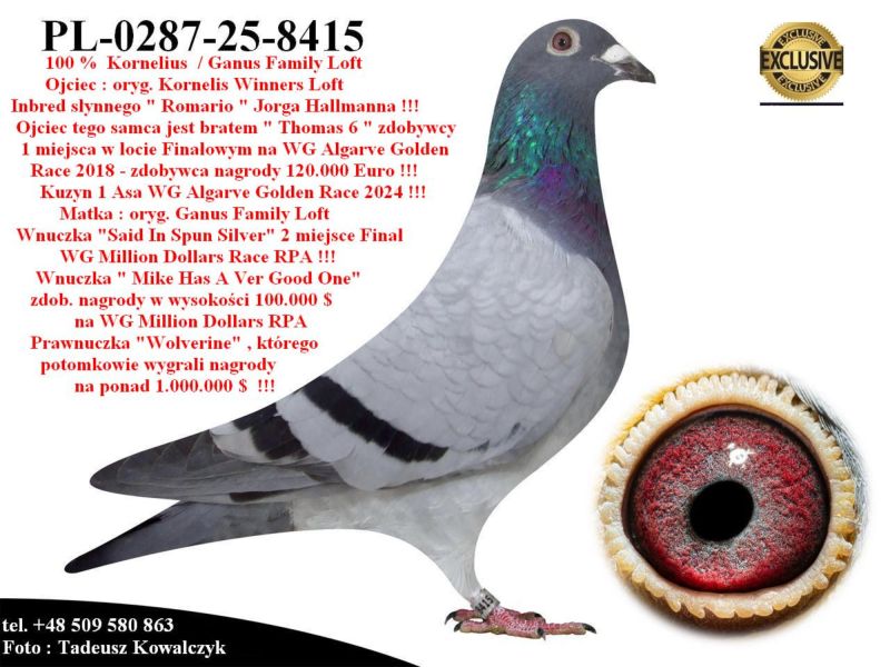AUKCJA PROMOCYJNA ROCZNIKA 2025 (Cena obowiązuje wyłącznie na tej aukcji) Profesjonalna hodowla z wieloletnim doświadczeniem, posiadająca w swoim stadzie materiał najwyższej światowej klasy, wywodzący się od takich hodowców jak: Jan Hooymans, Gerard Koopman, Mike Ganus, Tjeerd & Jouke Elzinga, Gino Clicque, Jos Vercammen, Jelle Roziers, Bart Geerinckx, Batenburg – v/d Merwe, Altmiks – Pigeons, Jo & Florian Hendriks, Kornelis Winner Loft – linia „Romario”, W & F Ebben, Bert Braspenning, Dirk van den Bulck, Peter v/d Merwe, Jan van de Pasch, Van Elsacker-Jepsen, Roger Desmet – Matthijs, Arie Dijkstra, Leo Heremans, Pieter Veenstra, Gaby Vandenabeele, Karl-Heinz Wichert, Hardy Kruger, Helmut & Alfons Klaas, Gebr. Janssen. Najwyższej klasy materiał hodowlany – najlepsze linie danych Hodowców. Wszystkie wylicytowane gołębie będą dostarczane firmą kurierską.