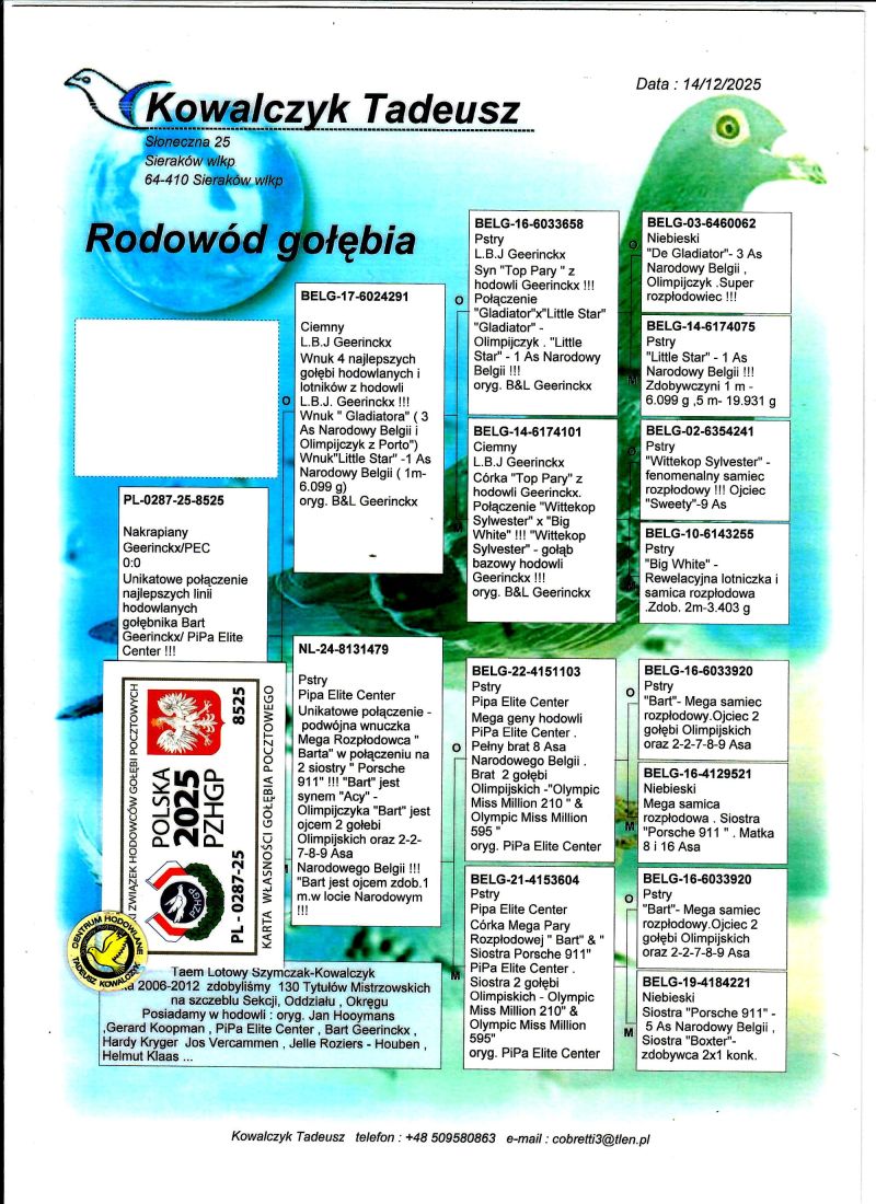PL-0287-25-8525 Połączenie najlepszych gołębi z hodowli Bart Geerinckx / PiPa Elite Center
