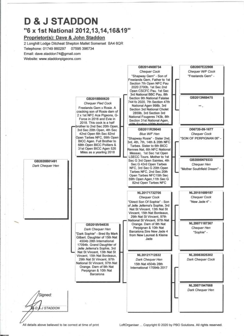 Oryginalny D&J Staddon. Czołowy hodowca w Anglii na loty Narodowe. Gołąb na dystans.