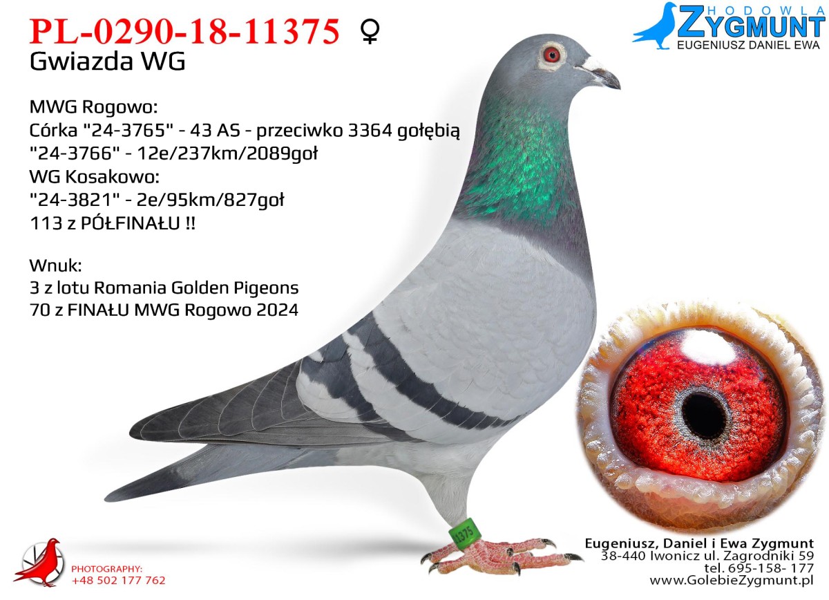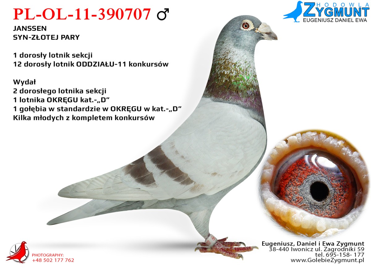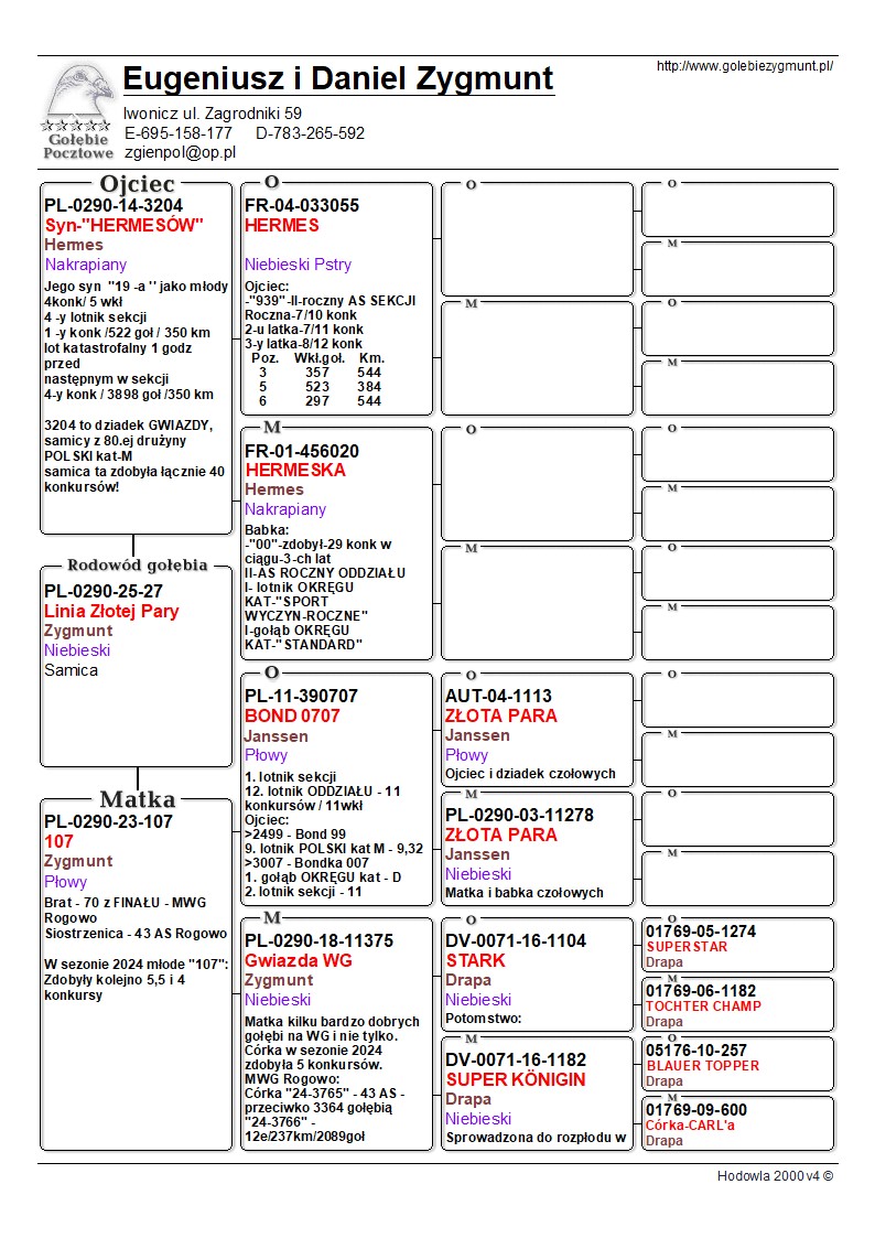 Gołąb o silnym genetycznym zapleczu WG i rozpłodu, idealny do dalszej hodowli. ***Możliwość odbioru na wystawie ogólnopolskiej w Katowicach***Transport: do 2 sztuk – 100 zł, 3–4 sztuki – 150 zł, powyżej 5 sztuk – 200 zł---Sezon 2025 przyniósł kolejne świetne wyniki – zdobyliśmy 4. i 5. miejsce w oddziale oraz tytuł II vice-mistrza oddziału w kategoriach MP oraz kat-A. Na wspólnych gołębnikach nasze ptaki pokazały klasę: 3. miejsce w finale WG Zatoka Puck, 7. AS WG Zatoka Puck, 36. AS OLR SuperCup, 33. i 86. AS OLR Mazury oraz 11. miejsce drużynowo na WG Zatoka Puck. Poprzedni sezon 2024 był jednym z najlepszych w naszej historii – 1., 3. i 4. miejsce w oddziale to wynik, jakiego jeszcze nie było. Do tego 1. i 2. miejsce w kat. MP oraz 1. w kat. A. Sezon zakończyliśmy z 9 gołębiami z 6 konkursami (w tym 5 pierwszych w oddziale) i aż 86 gołębiami z ponad 4 konkursami. Na wspólnych gołębnikach również liczne sukcesy: 2. z finału OLR Mazury, 16. z Ekstra Finału WG Zatoka Puck, 12. z MWG Rogowo, 2. z WG Zatoka Puck, 70. z finału MWG Rogowo, 43. AS Rogowo, 55. z finału OLR SuperCup, 36. AS WG Podhale, a gołąb po naszym samcu zdobył 2. miejsce w finale OLR SuperCup. Więcej informacji w rodowodach lub pod numerem telefonu 783 265 592.