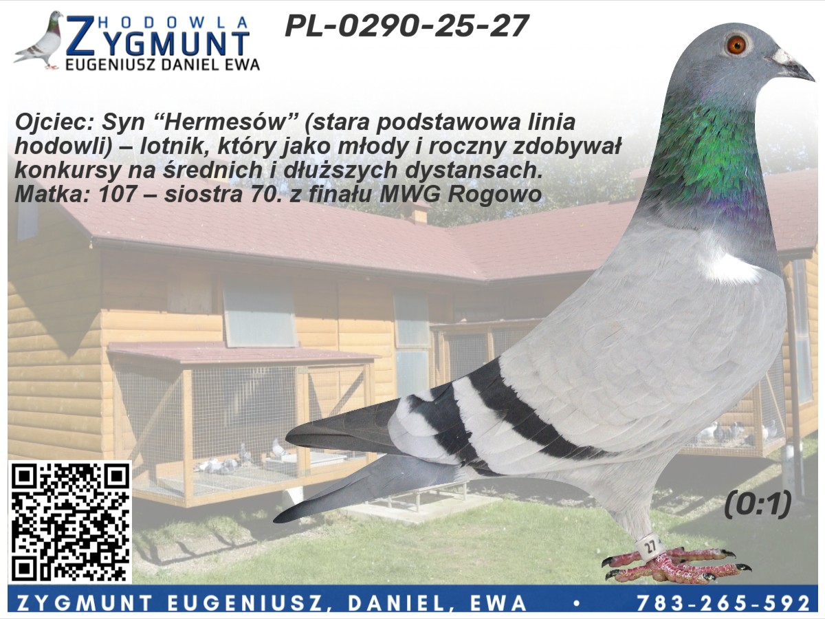 Ojciec: Syn “Hermesów” (stara podstawowa linia hodowli) – lotnik, który jako młody i roczny zdobywał konkursy na średnich i dłuższych dystansach, z potwierdzoną odpornością i charakterem.