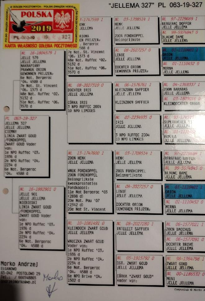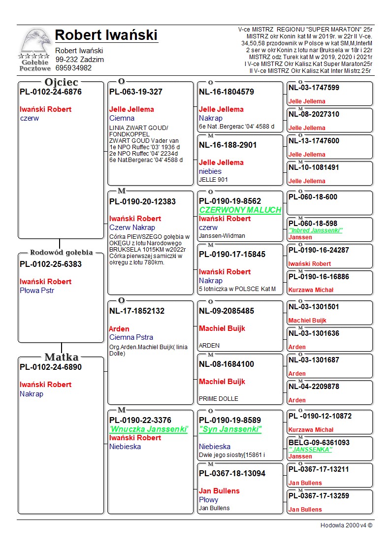 Hodowla gołębi oparta na samicy Janssen B-09-6361093 , która to w połączeniu ze szczepami gołębi dalekodystansowych (Arden, Jan Bullens, Widman RiP- mistrzowie Polski kat. M, R.Schloemer -A. Maziarz, J.Gajda, Jelle Jellema, Kurzawa BiM) wydała wiele bardzo dobrych lotników. W latach 2019-2023 gołębie z mojej hodowli osiągały 3 x 1 konkurs i 3 x 2 konkurs w lotach 700-1100 km na poziomie okręgu. W latach 2019-2022 w hodowli osiągnięte wyniki: Kat M -mistrz i II V-ce mistrz okręgu, 6 i 9 miejsce w okręgu Kat M-trzykrotne mistrzostwo oddziału i raz V-ce mistrzostwo Kat C-dwukrotnie V-ce mistrz oddziału i raz mistrz oddziału dwa razy II seria w okręgu w locie Narodowym Bruksela, w 2023 r. pierwsza seria okręgu Kalisz z lotu Ostenda (1109 km). 2025 rok I V-ce Mistrz Regionu VI kat. Super Maraton oraz II V-ce Mistrz kat. Intermistrzostwo okręgu. Koszt wysyłki gołębia to 150 zł. W przypadku zakupu trzech i więcej koszt to 80 zł.