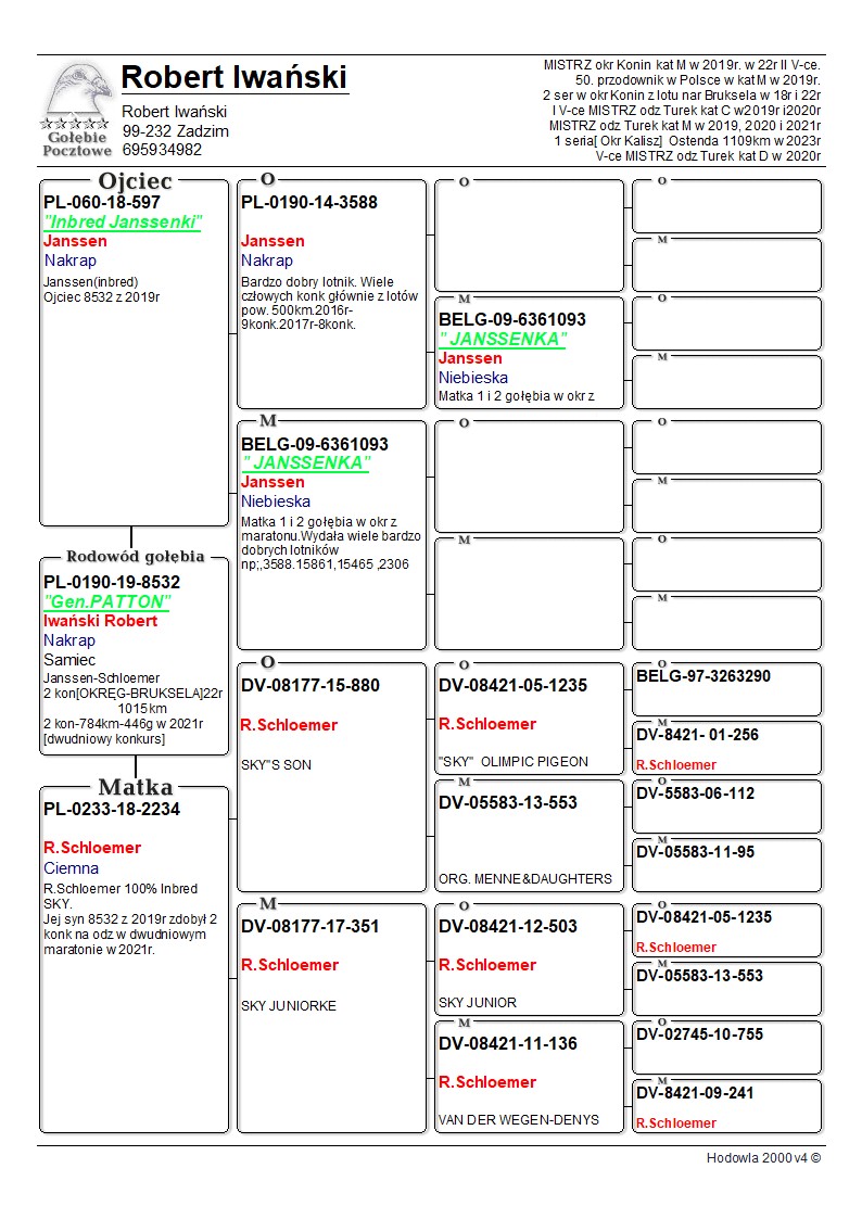 Hodowla gołębi oparta na samicy Janssen B-09-6361093 , która to w połączeniu ze szczepami gołębi dalekodystansowych (Arden, Jan Bullens, Widman RiP- mistrzowie Polski kat. M, R.Schloemer -A. Maziarz, J.Gajda, Jelle Jellema, Kurzawa BiM) wydała wiele bardzo dobrych lotników. W latach 2019-2023 gołębie z mojej hodowli osiągały 3 x 1 konkurs i 3 x 2 konkurs w lotach 700-1100 km na poziomie okręgu. W latach 2019-2022 w hodowli osiągnięte wyniki: Kat M -mistrz i II V-ce mistrz okręgu, 6 i 9 miejsce w okręgu Kat M-trzykrotne mistrzostwo oddziału i raz V-ce mistrzostwo Kat C-dwukrotnie V-ce mistrz oddziału i raz mistrz oddziału dwa razy II seria w okręgu w locie Narodowym Bruksela, w 2023 r. pierwsza seria okręgu Kalisz z lotu Ostenda (1109 km). 2025 rok I V-ce Mistrz Regionu VI kat. Super Maraton oraz II V-ce Mistrz kat. Intermistrzostwo okręgu. Koszt wysyłki gołębia to 150 zł. W przypadku zakupu trzech i więcej koszt to 80 zł.