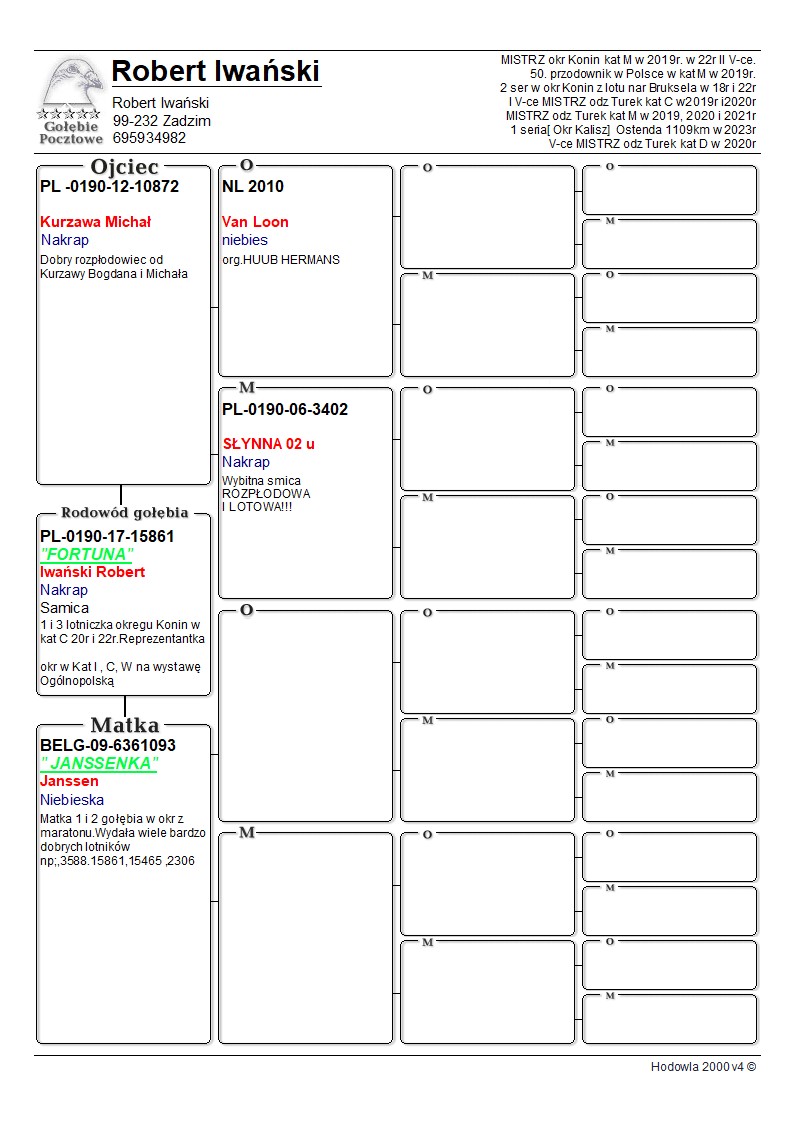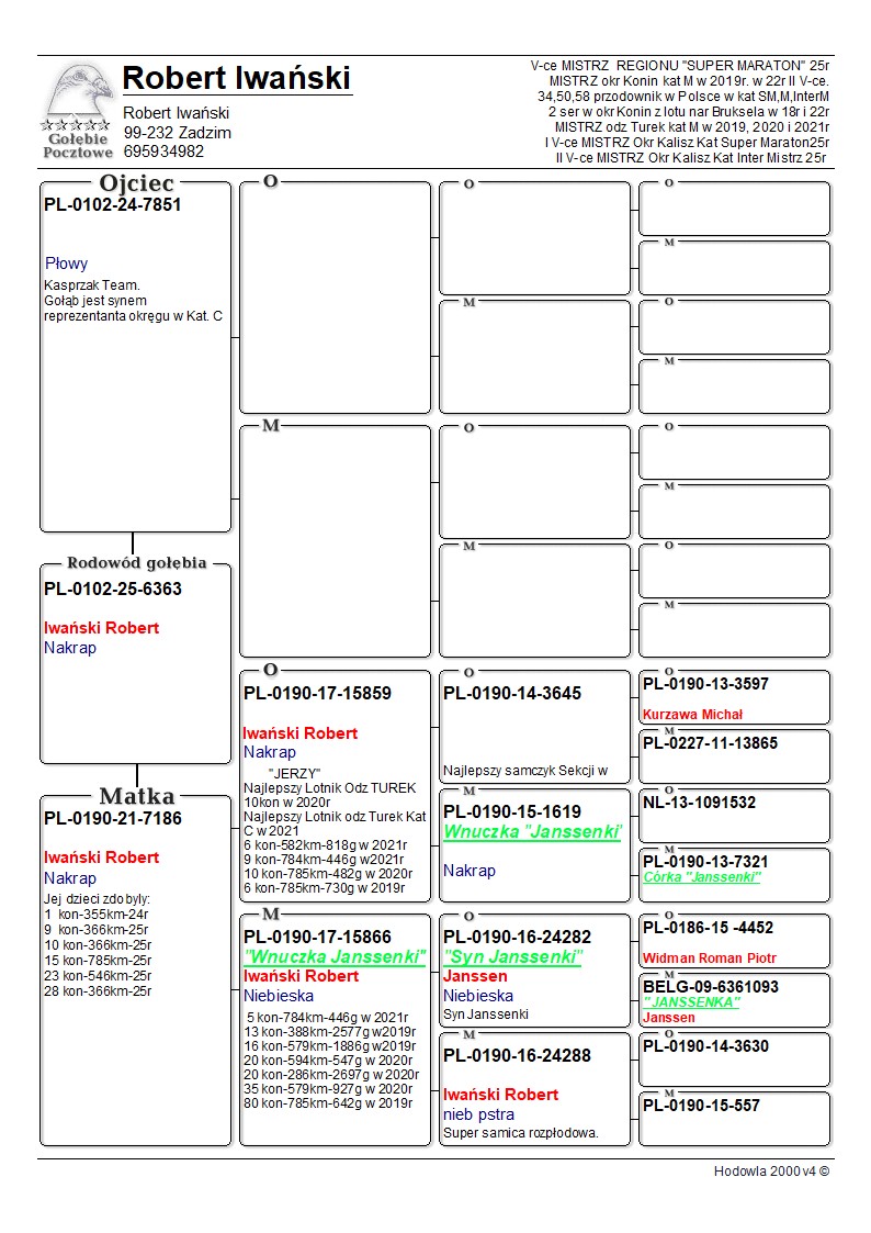 Hodowla gołębi oparta na samicy Janssen B-09-6361093 , która to w połączeniu ze szczepami gołębi dalekodystansowych (Arden, Jan Bullens, Widman RiP- mistrzowie Polski kat. M, R.Schloemer -A. Maziarz, J.Gajda, Jelle Jellema, Kurzawa BiM) wydała wiele bardzo dobrych lotników. W latach 2019-2023 gołębie z mojej hodowli osiągały 3 x 1 konkurs i 3 x 2 konkurs w lotach 700-1100 km na poziomie okręgu. W latach 2019-2022 w hodowli osiągnięte wyniki: Kat M -mistrz i II V-ce mistrz okręgu, 6 i 9 miejsce w okręgu Kat M-trzykrotne mistrzostwo oddziału i raz V-ce mistrzostwo Kat C-dwukrotnie V-ce mistrz oddziału i raz mistrz oddziału dwa razy II seria w okręgu w locie Narodowym Bruksela, w 2023 r. pierwsza seria okręgu Kalisz z lotu Ostenda (1109 km). 2025 rok I V-ce Mistrz Regionu VI kat. Super Maraton oraz II V-ce Mistrz kat. Intermistrzostwo okręgu. Koszt wysyłki gołębia to 150 zł. W przypadku zakupu trzech i więcej koszt to 80 zł.