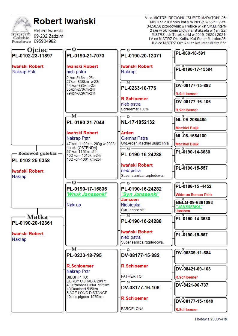 Hodowla gołębi oparta na samicy Janssen B-09-6361093 , która to w połączeniu ze szczepami gołębi dalekodystansowych (Arden, Jan Bullens, Widman RiP- mistrzowie Polski kat. M, R.Schloemer -A. Maziarz, J.Gajda, Jelle Jellema, Kurzawa BiM) wydała wiele bardzo dobrych lotników. W latach 2019-2023 gołębie z mojej hodowli osiągały 3 x 1 konkurs i 3 x 2 konkurs w lotach 700-1100 km na poziomie okręgu. W latach 2019-2022 w hodowli osiągnięte wyniki: Kat M -mistrz i II V-ce mistrz okręgu, 6 i 9 miejsce w okręgu Kat M-trzykrotne mistrzostwo oddziału i raz V-ce mistrzostwo Kat C-dwukrotnie V-ce mistrz oddziału i raz mistrz oddziału dwa razy II seria w okręgu w locie Narodowym Bruksela, w 2023 r. pierwsza seria okręgu Kalisz z lotu Ostenda (1109 km). 2025 rok I V-ce Mistrz Regionu VI kat. Super Maraton oraz II V-ce Mistrz kat. Intermistrzostwo okręgu. Koszt wysyłki gołębia to 150 zł. W przypadku zakupu trzech i więcej koszt to 80 zł.