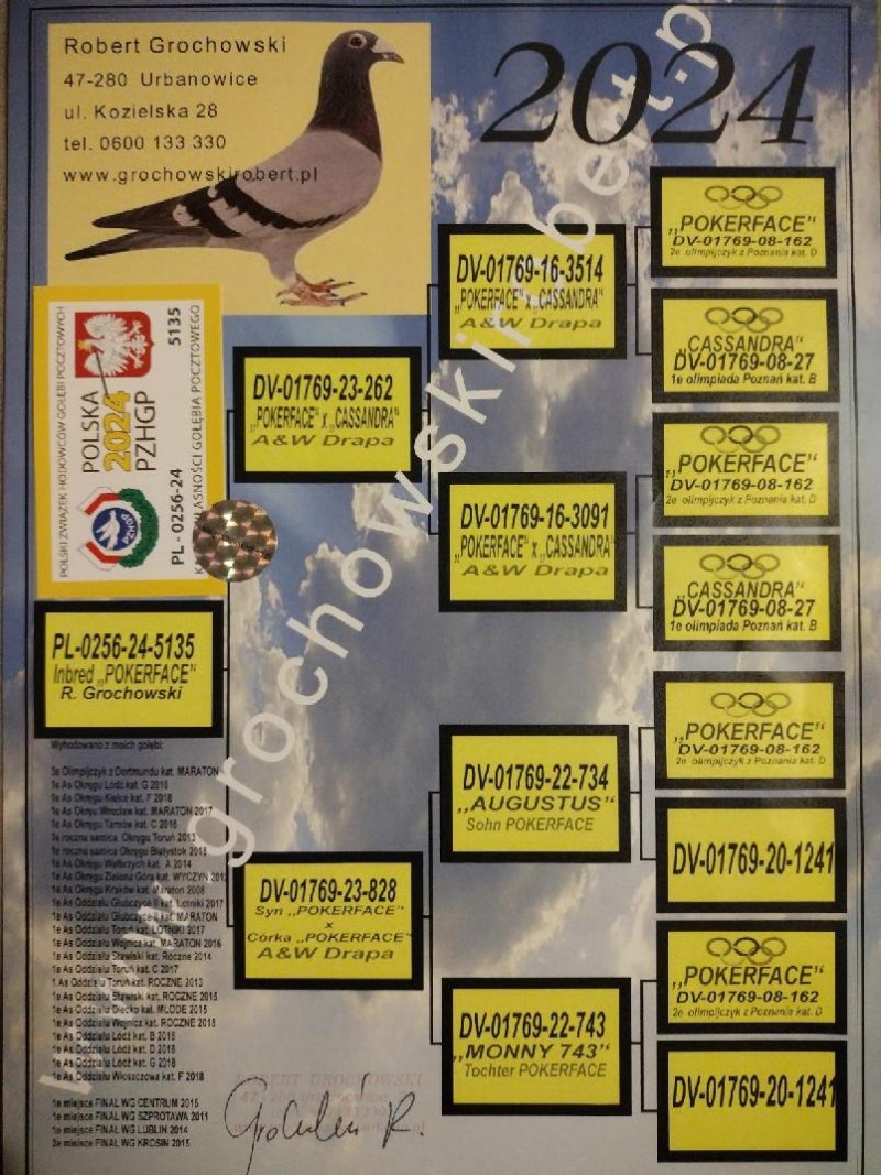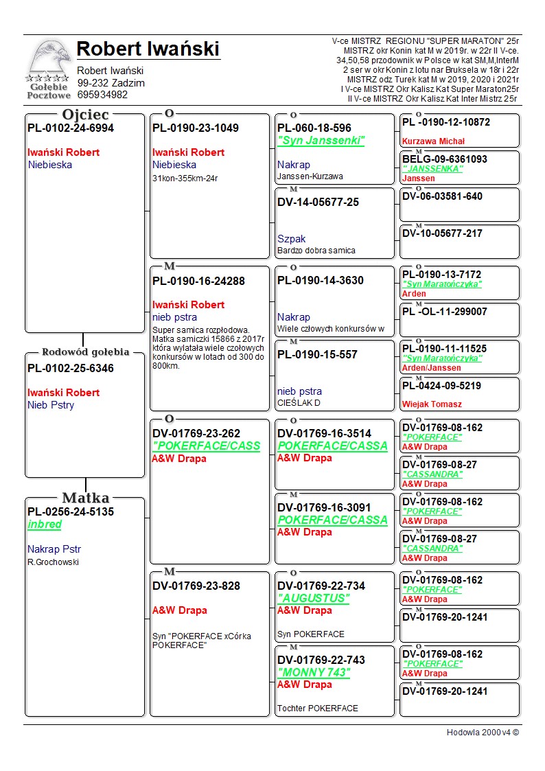 Hodowla gołębi oparta na samicy Janssen B-09-6361093 , która to w połączeniu ze szczepami gołębi dalekodystansowych (Arden, Jan Bullens, Widman RiP- mistrzowie Polski kat. M, R.Schloemer -A. Maziarz, J.Gajda, Jelle Jellema, Kurzawa BiM) wydała wiele bardzo dobrych lotników. W latach 2019-2023 gołębie z mojej hodowli osiągały 3 x 1 konkurs i 3 x 2 konkurs w lotach 700-1100 km na poziomie okręgu. W latach 2019-2022 w hodowli osiągnięte wyniki: Kat M -mistrz i II V-ce mistrz okręgu, 6 i 9 miejsce w okręgu Kat M-trzykrotne mistrzostwo oddziału i raz V-ce mistrzostwo Kat C-dwukrotnie V-ce mistrz oddziału i raz mistrz oddziału dwa razy II seria w okręgu w locie Narodowym Bruksela, w 2023 r. pierwsza seria okręgu Kalisz z lotu Ostenda (1109 km). 2025 rok I V-ce Mistrz Regionu VI kat. Super Maraton oraz II V-ce Mistrz kat. Intermistrzostwo okręgu. Koszt wysyłki gołębia to 150 zł. W przypadku zakupu trzech i więcej koszt to 80 zł.
