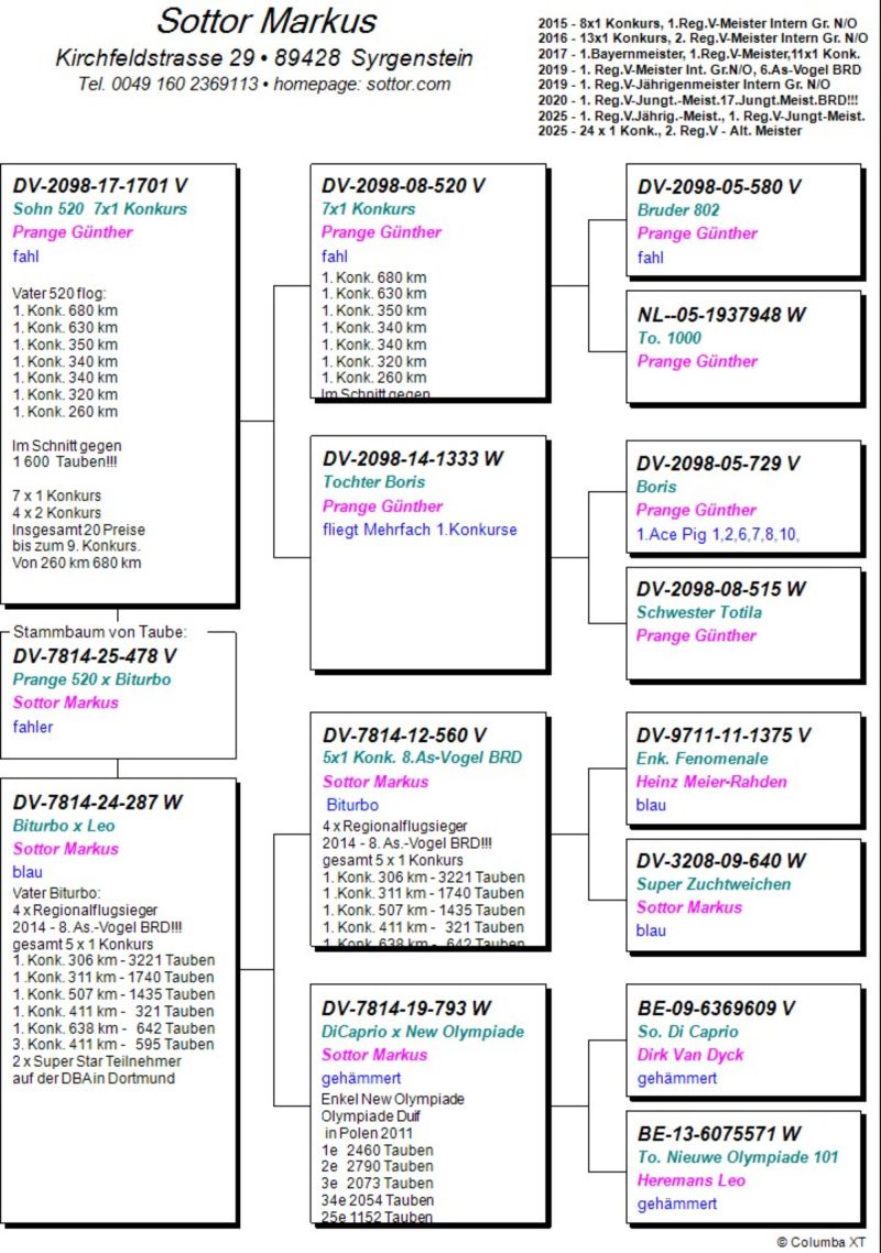 Oryg. gołąb z hodowli Markusa Sottor. Zapewniamy transport gołębi. Gołębie również będzie można odebrać w Katowicach w dniach 07-11.01.2026 r. po wcześniejszej wpłacie na konto. Gołębie znajdują się w Polsce. Więcej informacji w rodowodzie lub tel. 667895177.
