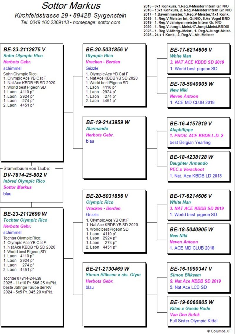 Oryg. gołąb z hodowli Markusa Sottor. Zapewniamy transport gołębi. Gołębie również będzie można odebrać w Katowicach w dniach 07-11.01.2026 r. po wcześniejszej wpłacie na konto. Gołębie znajdują się w Polsce. Więcej informacji w rodowodzie lub tel. 667895177.