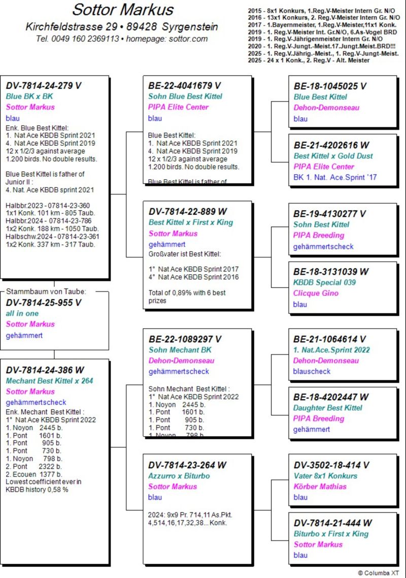 Oryg. gołąb z hodowli Markusa Sottor. Zapewniamy transport gołębi. Gołębie również będzie można odebrać w Katowicach w dniach 07-11.01.2026 r. po wcześniejszej wpłacie na konto. Gołębie znajdują się w Polsce. Więcej informacji w rodowodzie lub tel. 667895177.