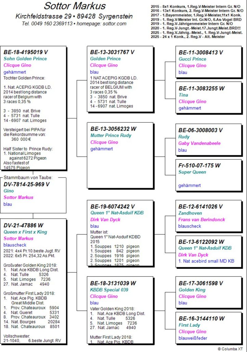 Oryg. gołąb z hodowli Markusa Sottor. Zapewniamy transport gołębi. Gołębie również będzie można odebrać w Katowicach w dniach 07-11.01.2026 r. po wcześniejszej wpłacie na konto. Gołębie znajdują się w Polsce. Więcej informacji w rodowodzie lub tel. 667895177.